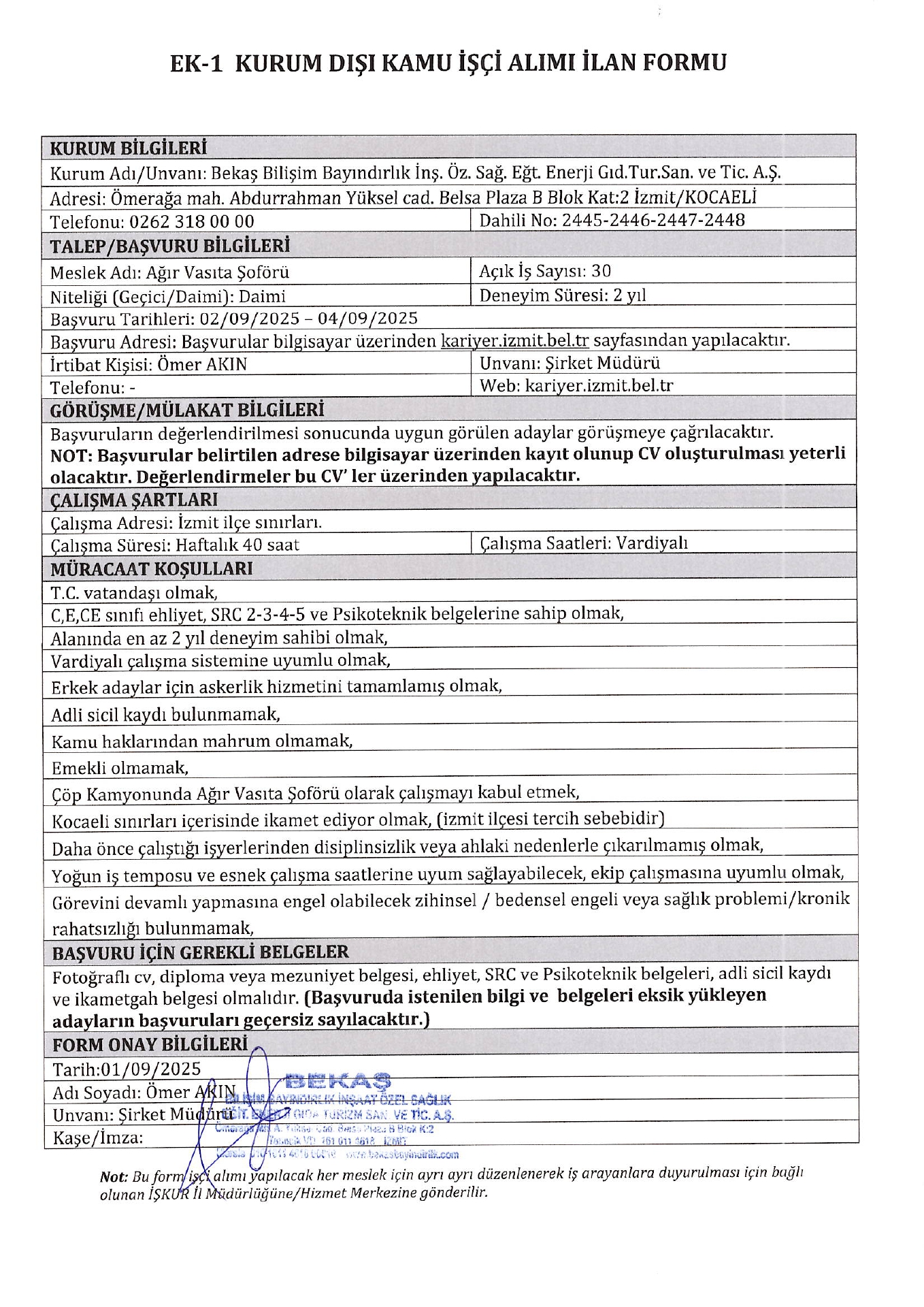 Kocaeli Bekaş Bilişim 30 İşçi Alacak. Son başvuru tarihi 4 eylül 2025