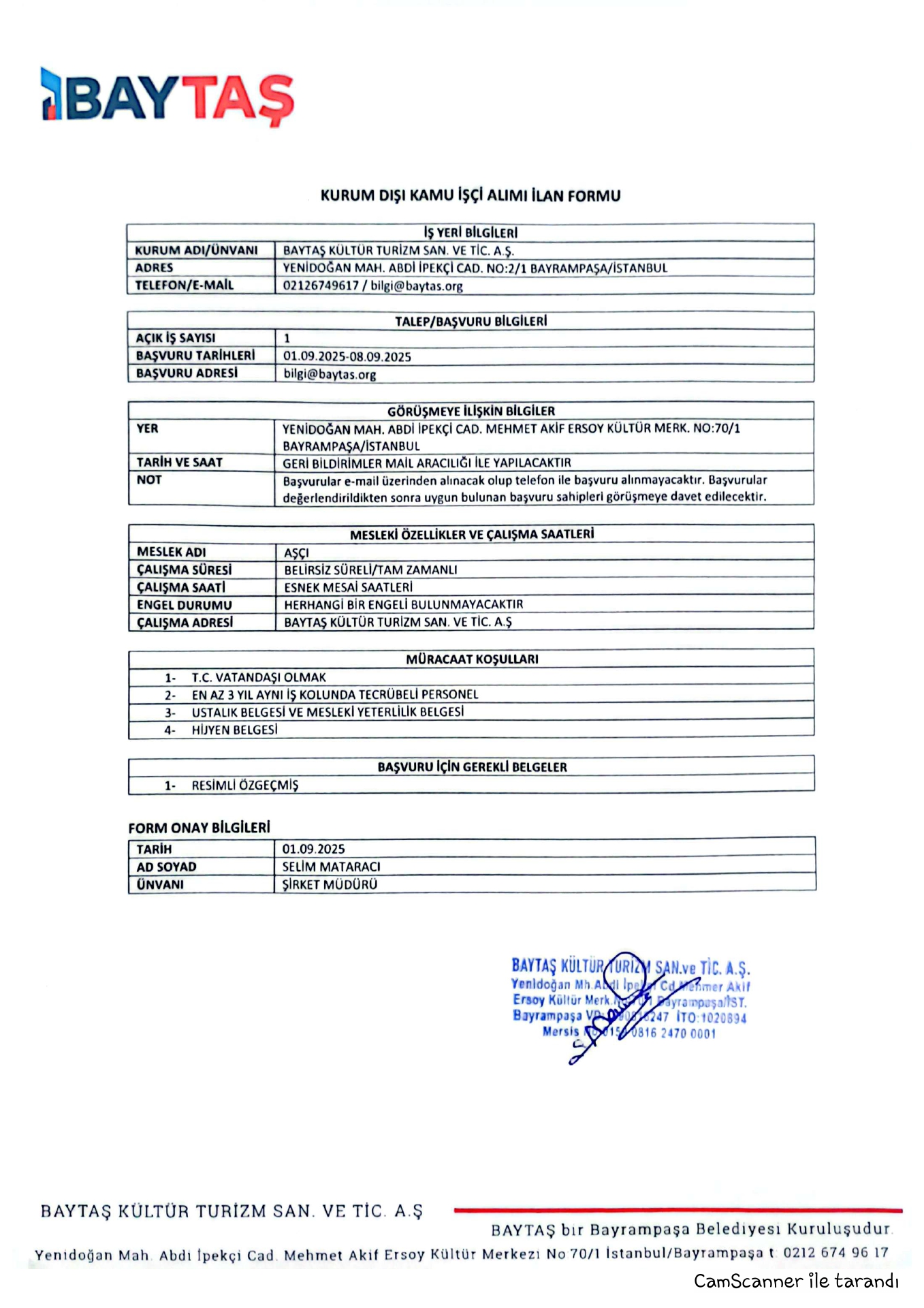 İstanbul Baytaş 1 İşçi Alacak. Son başvuru tarihi 8 eylül 2025