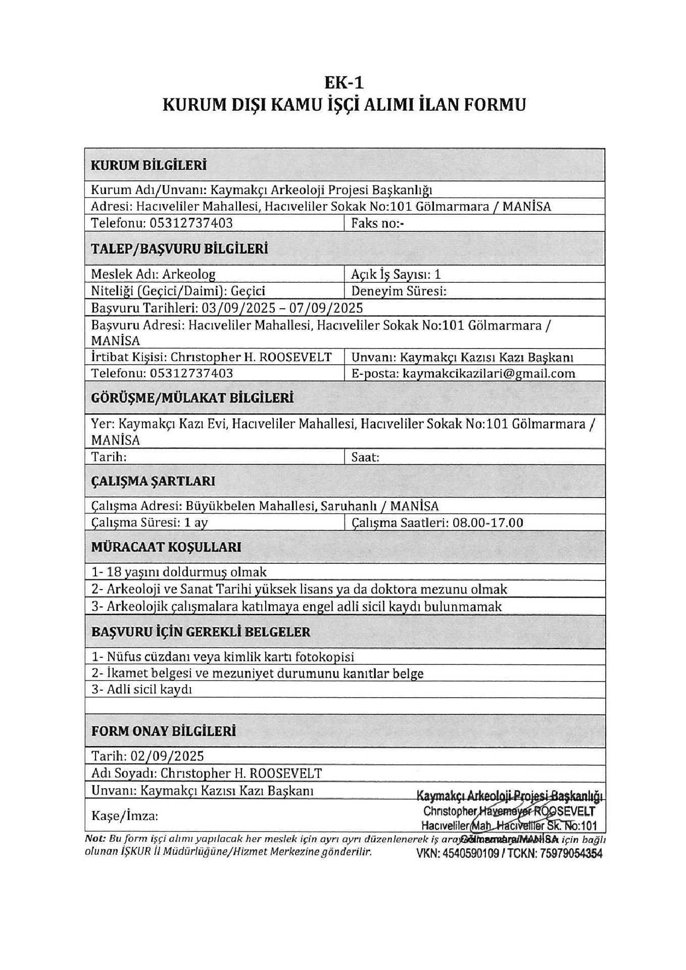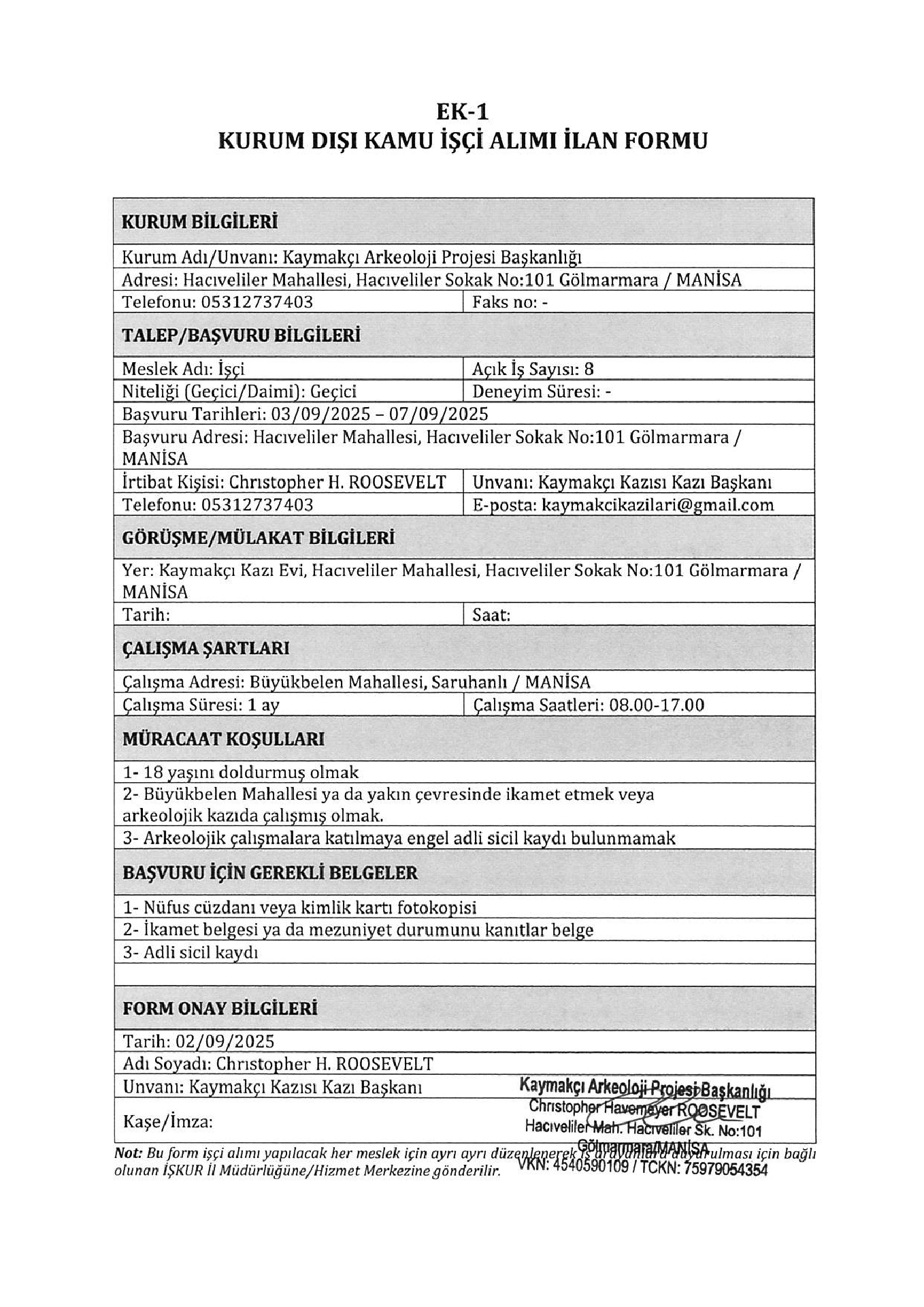Manisa Kaymakçı Arkeoloji Proje Başkanlığı Geçici 9 İşçi Alacak. Son başvuru tarihi 5 eylül 2025