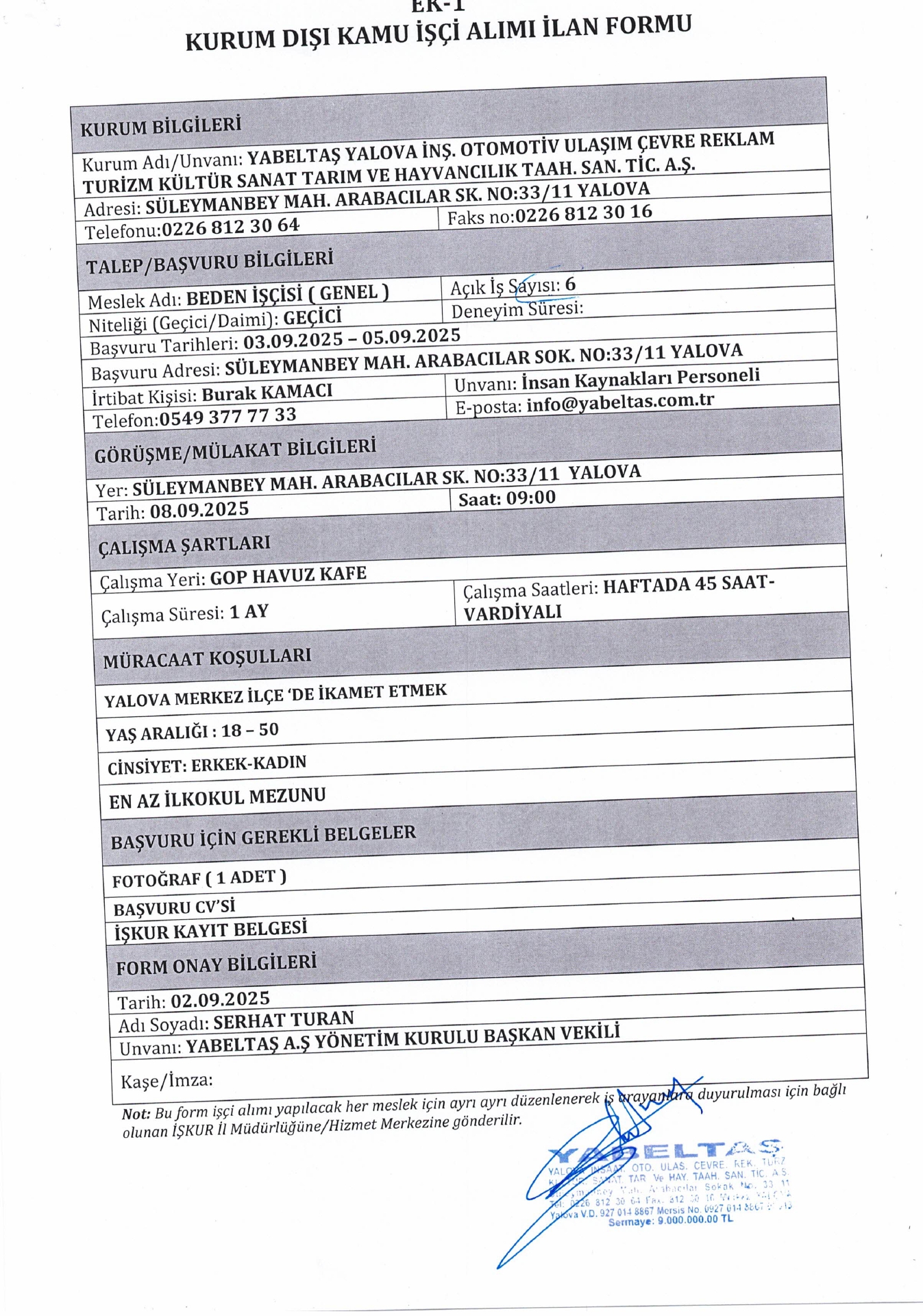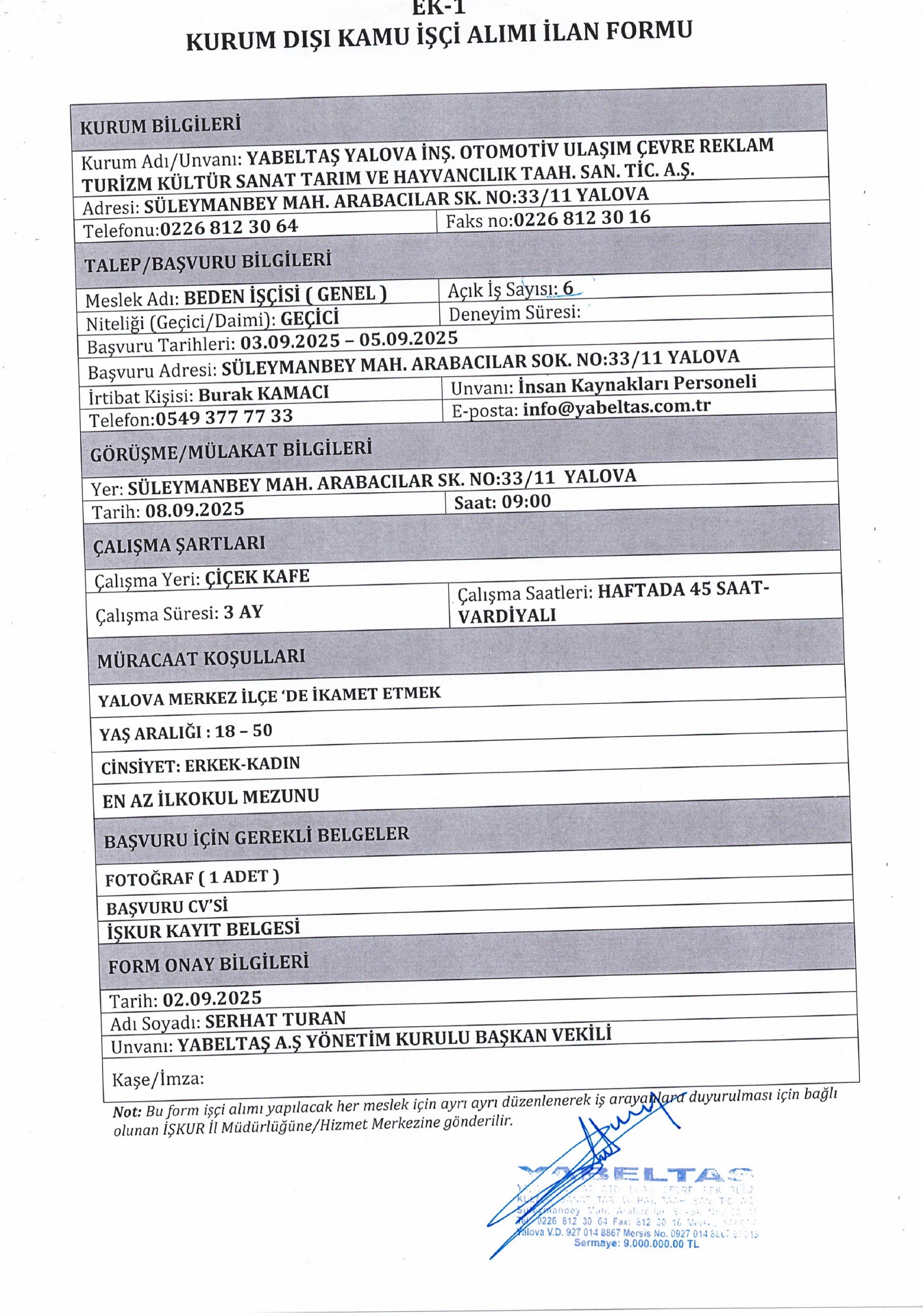 Yalova Yebeltaş Geçici 12 İşçi Alacak. Son başvuru tarihi 5 eylül 2025