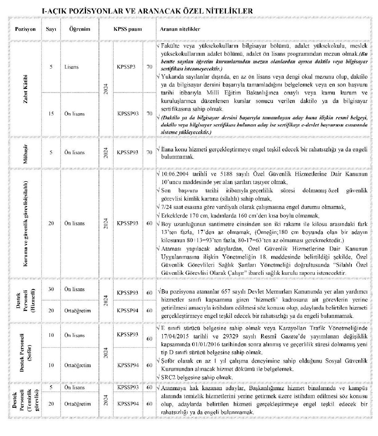 Başkanlığımız bünyesinde istihdam edilmek üzere, 657 sayılı Devlet Memurları Kanununun Değişik 4. maddesinin (B) fıkrası uyarınca 06.06.1978 tarihli vc 7/15754 sayılı Bakanlar Kurulu Kararı ile yürürlüğe konulan Sözleşmeli Personel Çalıştırılmasına İlişkin Esasların "Sınav Şartı" başlıklı Ek 2. maddesi gereğince, aşağıdaki tabloda belirtilen sözleşmeli pozisyonlara, 2024 yılı KPSS puanlan esas alınarak, Başkanlığımızca yapılacak uygulamalı ve sözlü veya sözlü sınav sonucuna göre personel alınacaktır.