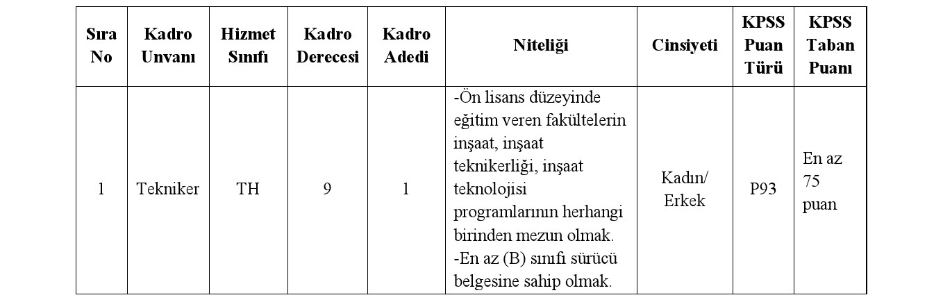 Yozgat ili Çayıralan Belediye Başkanlığı bünyesinde, 657 sayılı Devlet Memurları Kanununa tabi olarak istihdam edilmek üzere; Mahalli İdarelere İlk Defa Atanacaklara Dair Sınav ve Atama Yönetmeliği hükümlerine göre aşağıda unvanı, sınıfı, derecesi, adedi, nitelikleri, KPSS puan türü, KPSS taban puanı ve diğer şartları taşımak kaydıyla belirtilen boş kadrolara açıktan atama yoluyla memur alınacaktır.