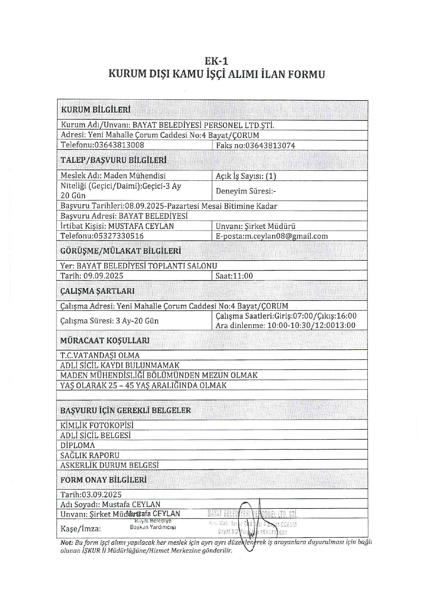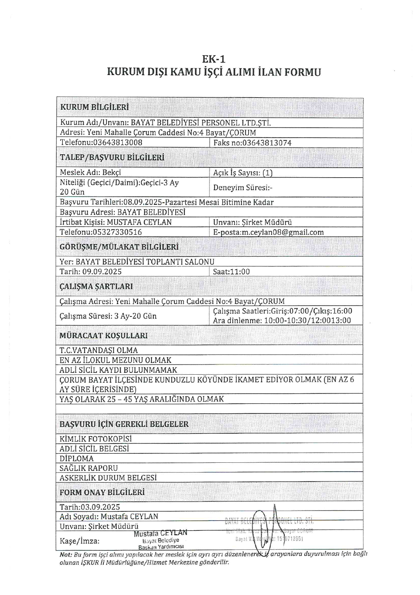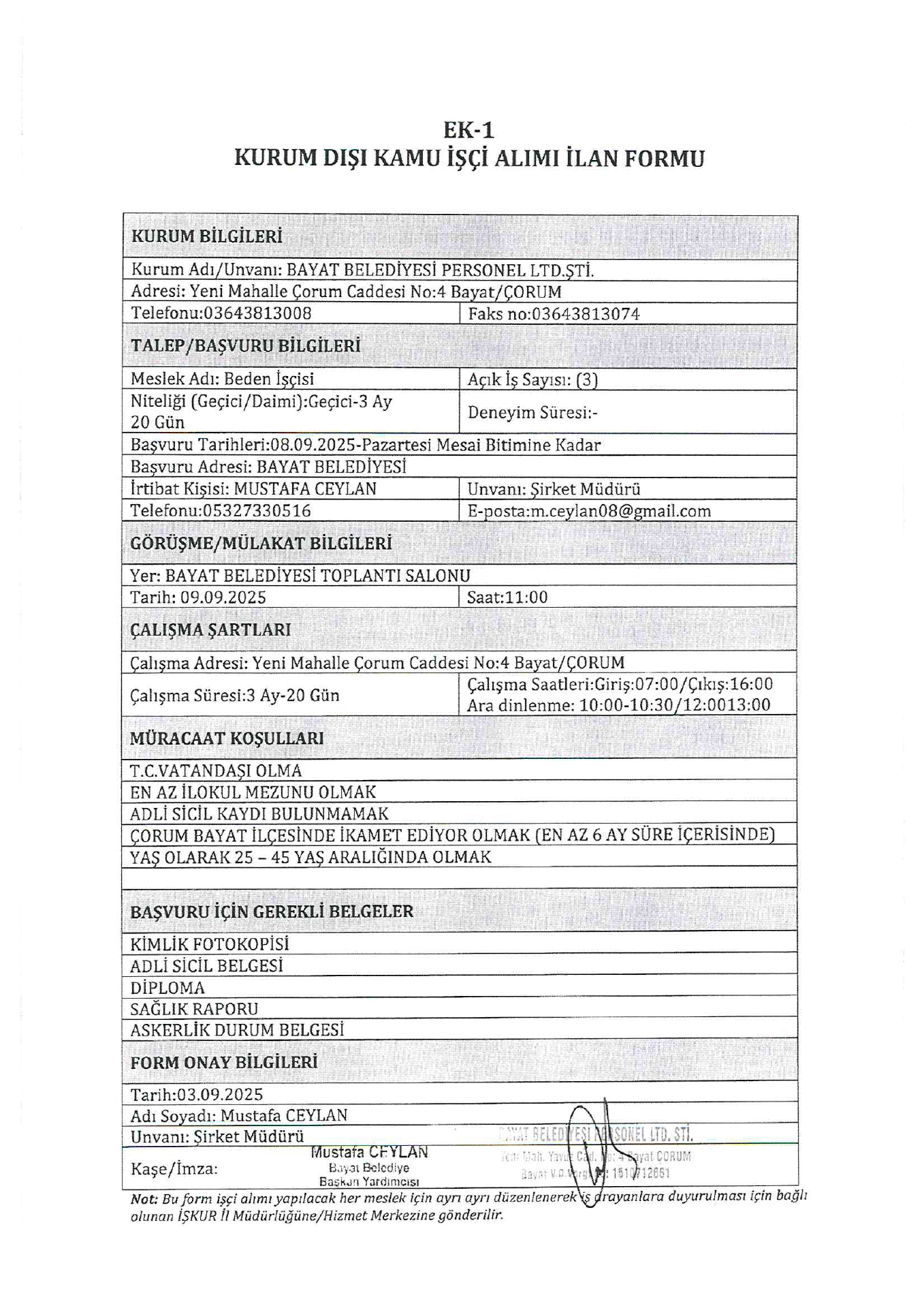 Çorum Bayat Belediyesi Geçici 5 İşçi Alacak. Son başvuru tarihi 8 eylül 2025