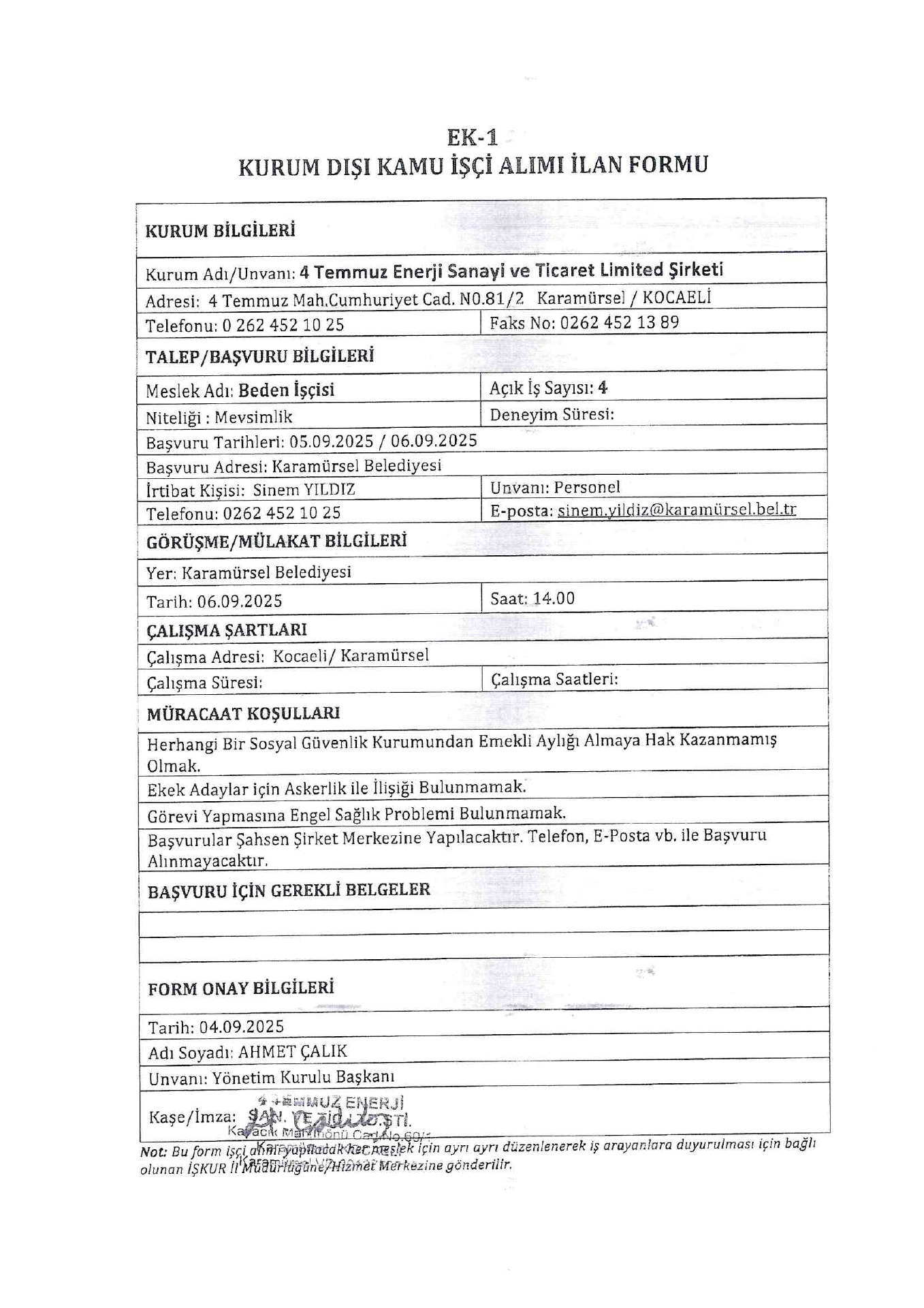 Kocaeli 4 Temmuz Enerji Sanayi Geçici 4 İşçi Alacak. Son başvuru tarihi 6 eylül 2025