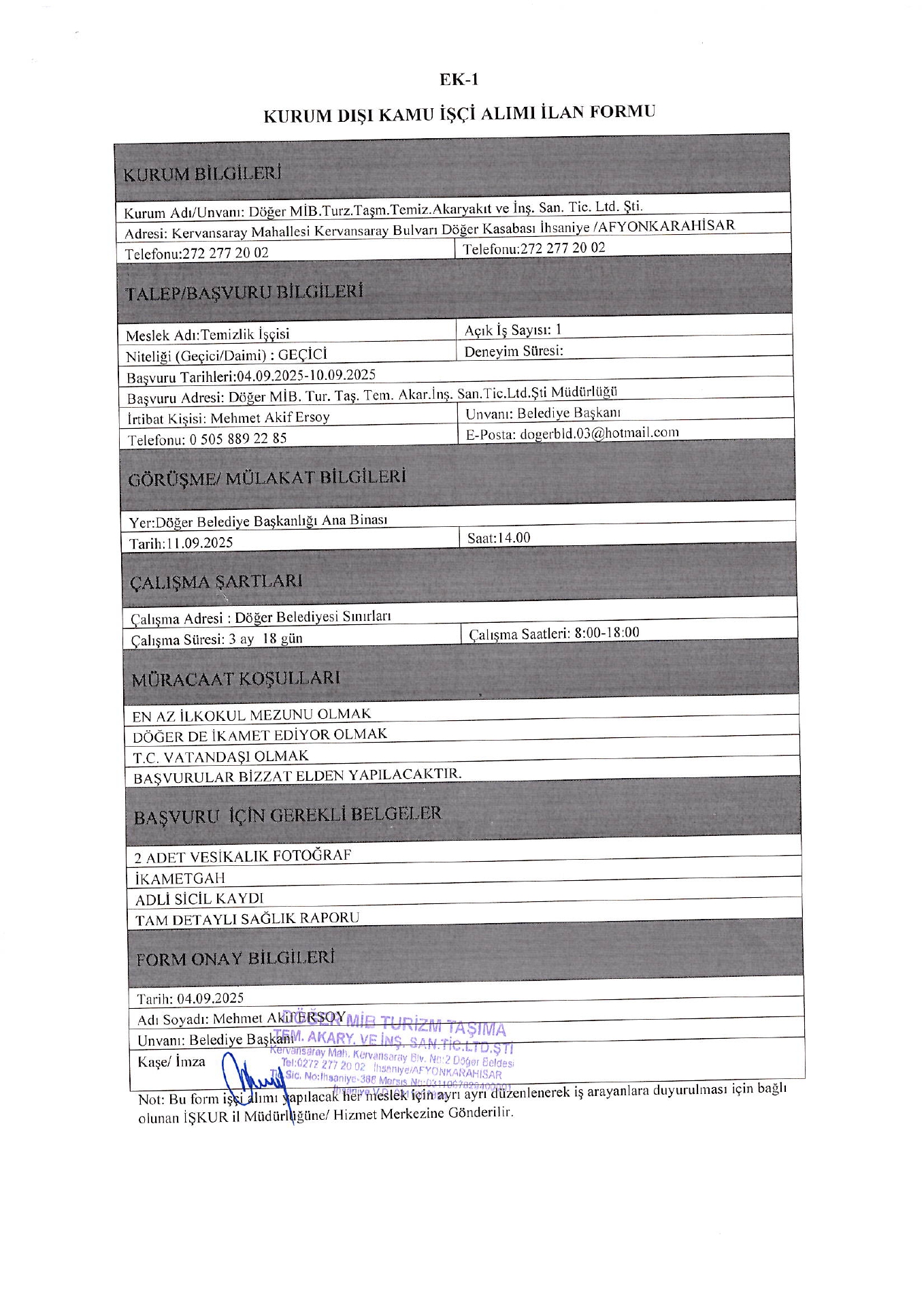 Afyonkarahisar Döğer Mib Turizm Geçici 1 İşçi Alacak. Son başvuru tarihi 10 eylül 2025