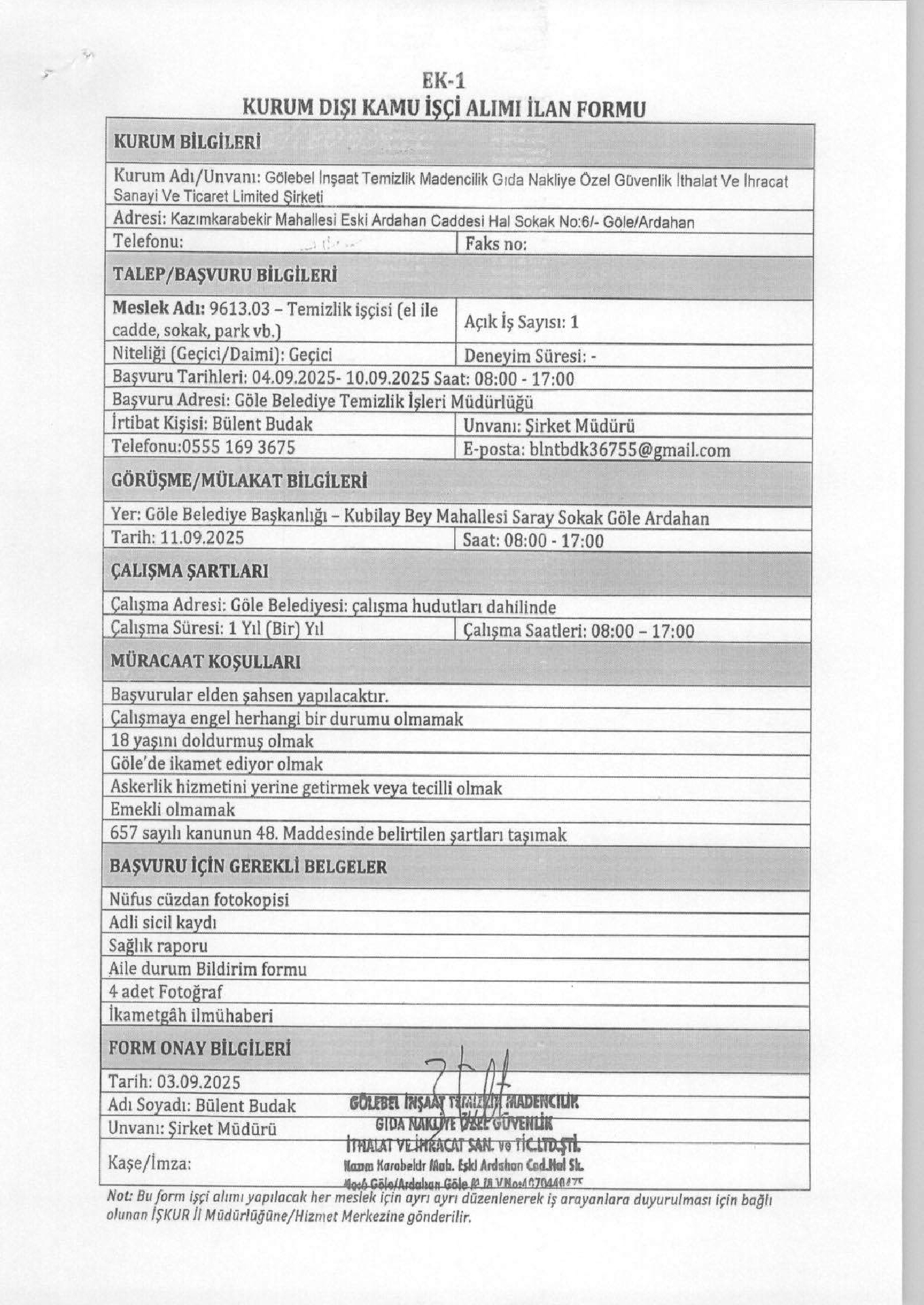 Ardahan Gölebel İnşaat Geçici 1 İşçi Alacak. Son başvuru tarihi 10 eylül 2025