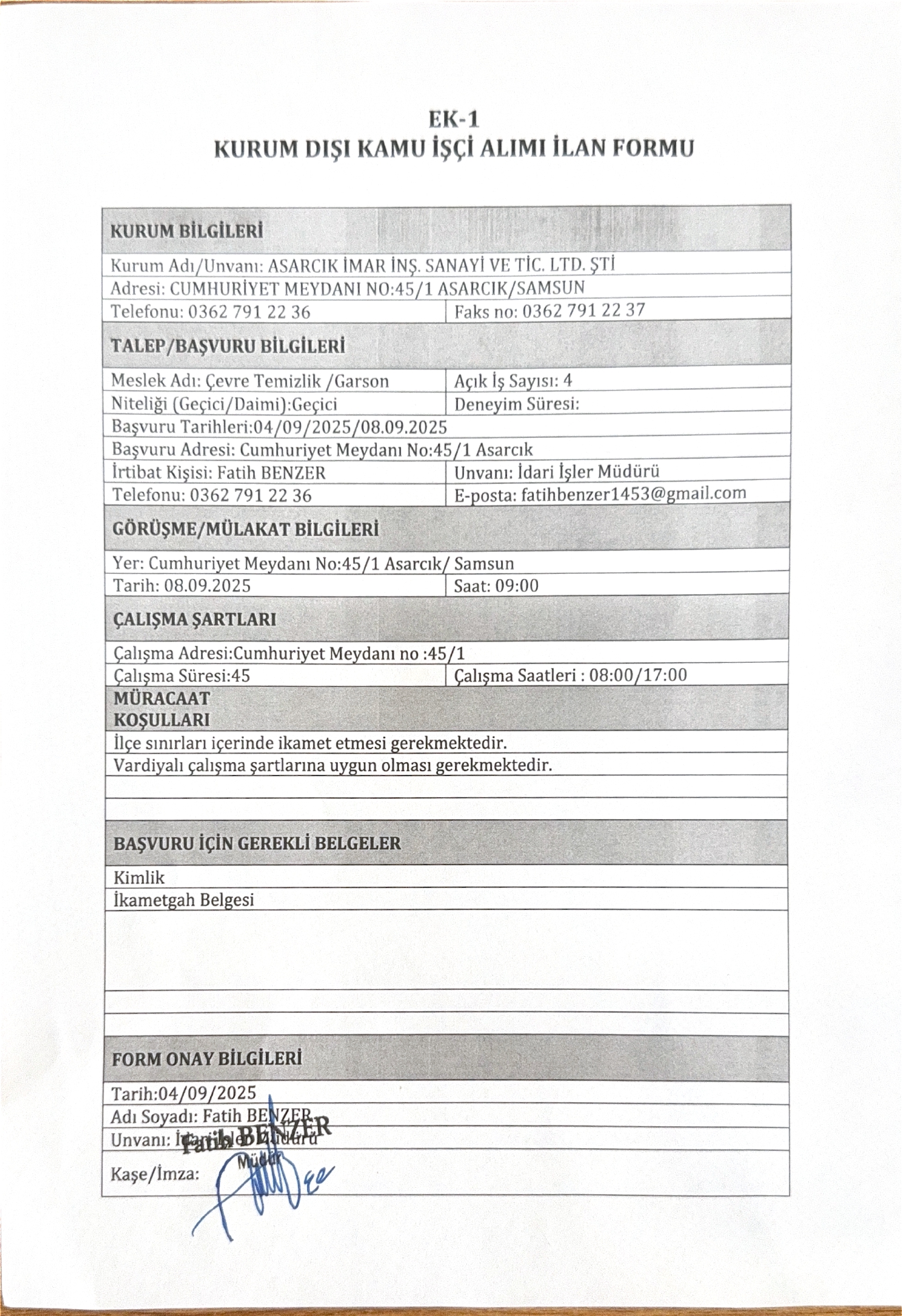 Samsun Asarcık İmar Geçici 4 İşçi Alacak. Son başvuru tarihi 8 eylül 2025