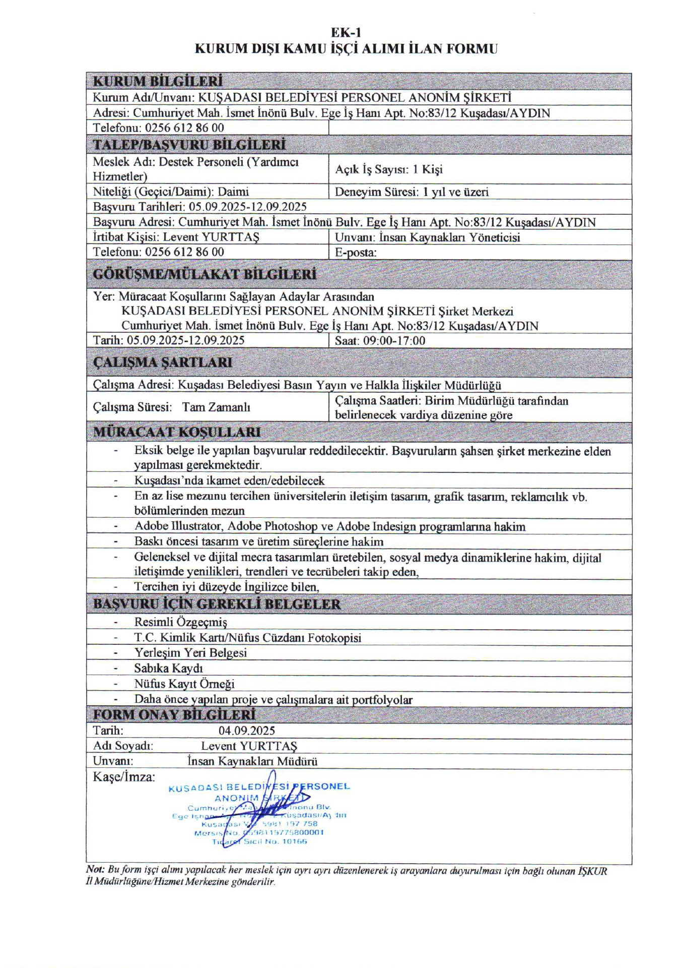 Aydın Kuşadası Belediyesi 1 İşçi Alacak. Son başvuru tarihi 12 eylül 2025