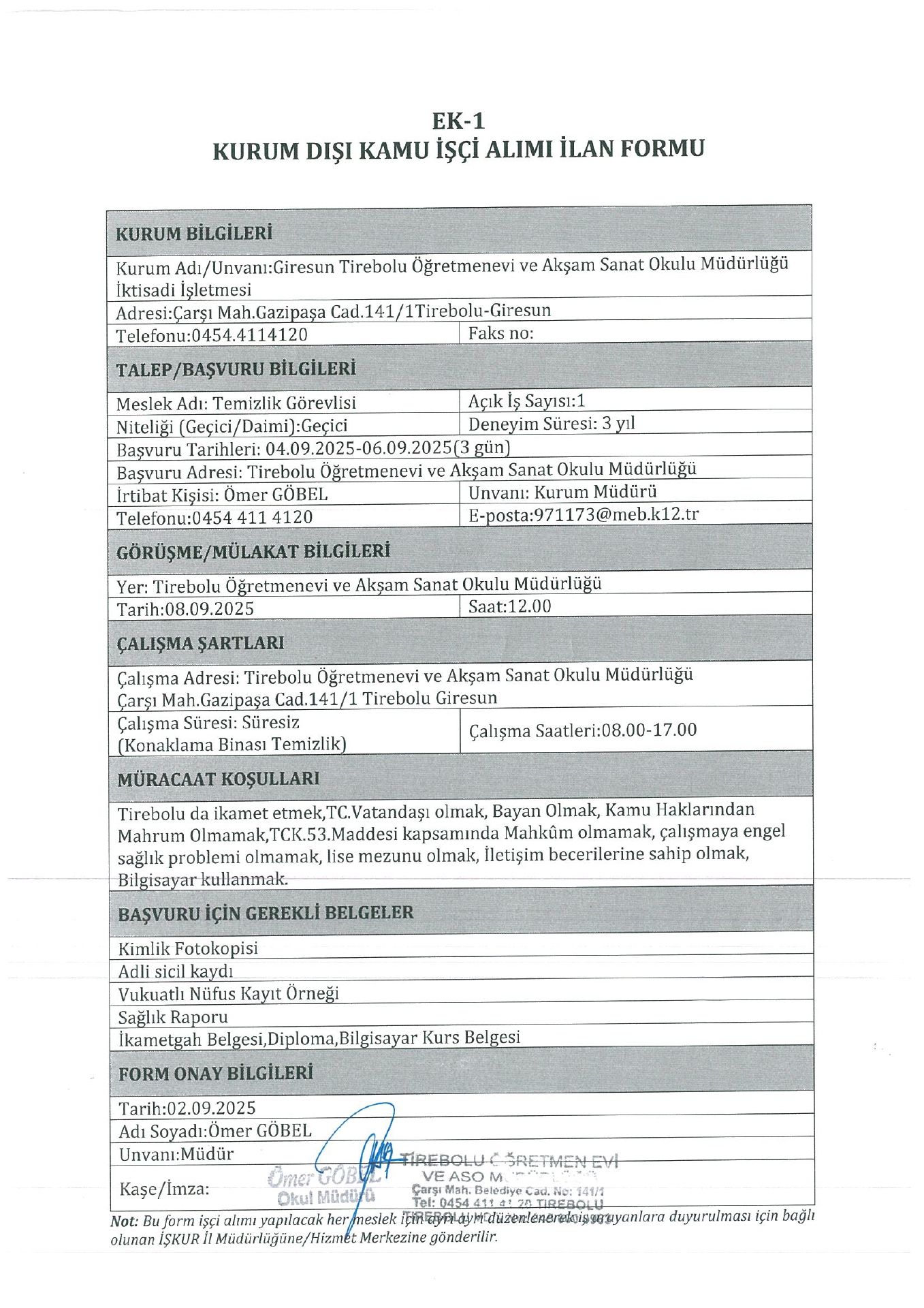 Giresun Tirebolu Öğretmenevi Geçici 1 İşçi Alacak. Son başvuru tarihi 6 eylül 2025