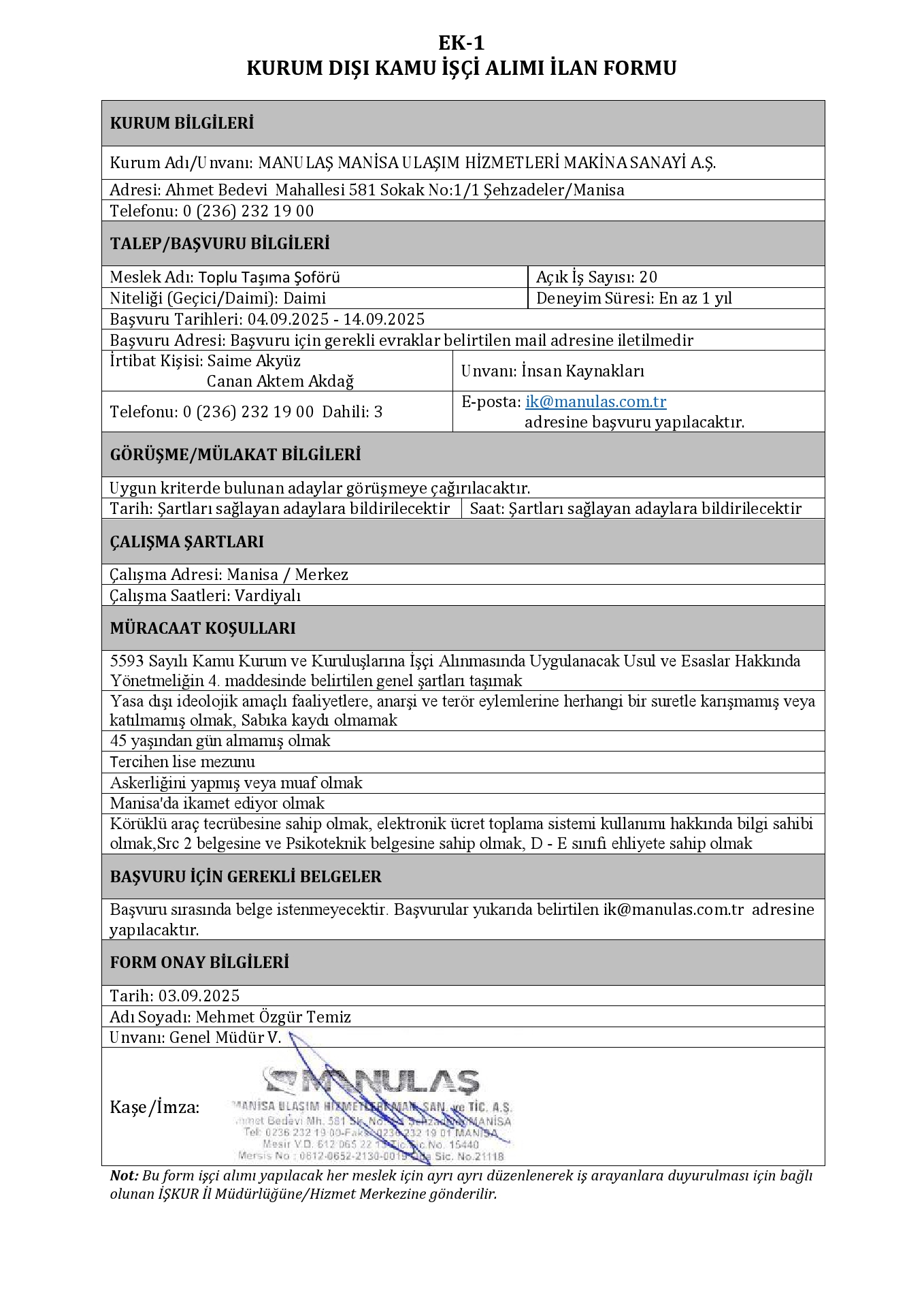 Manisa Manulaş 20 İşçi Alacak. Son başvuru tarihi 14 eylül 2025