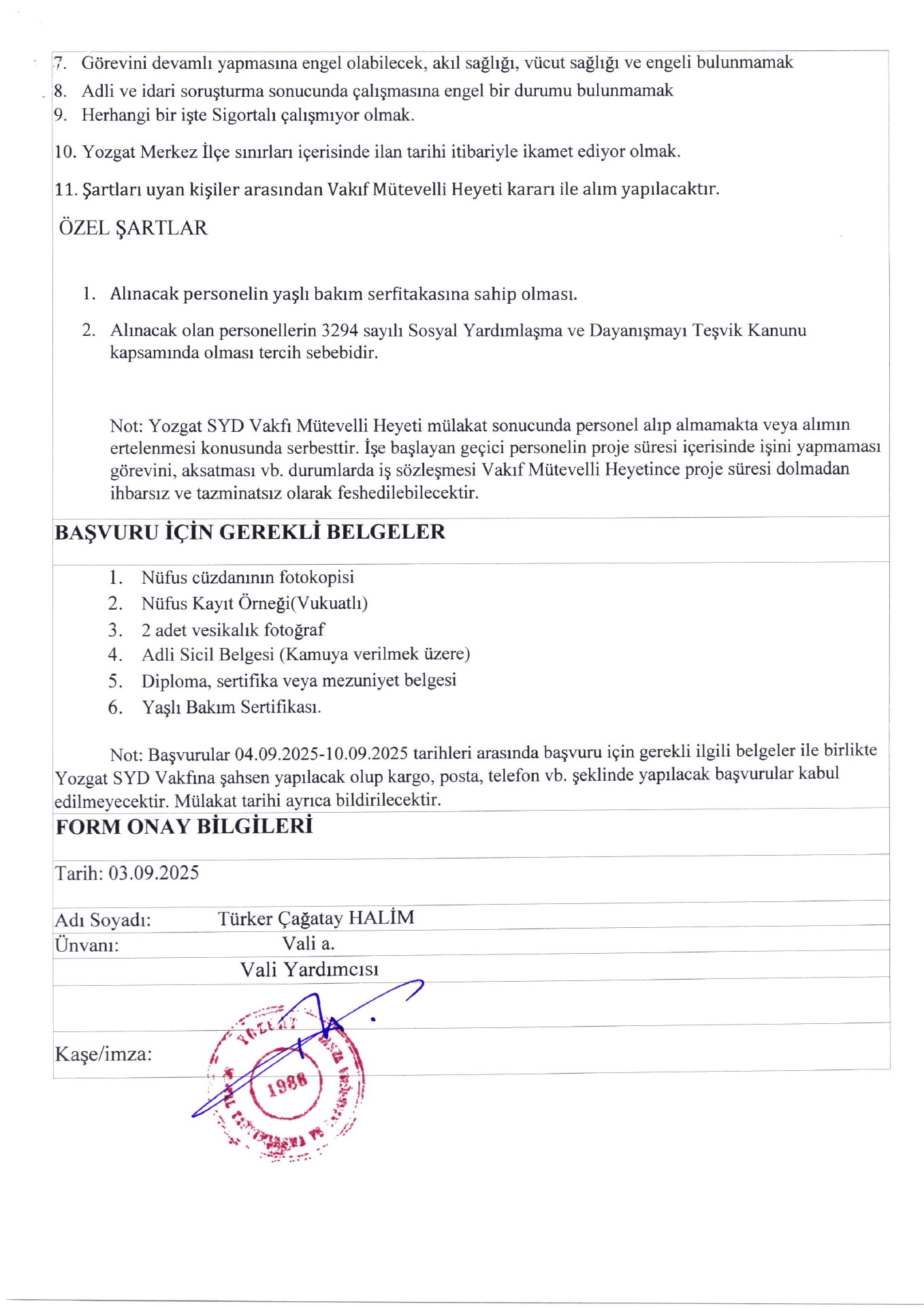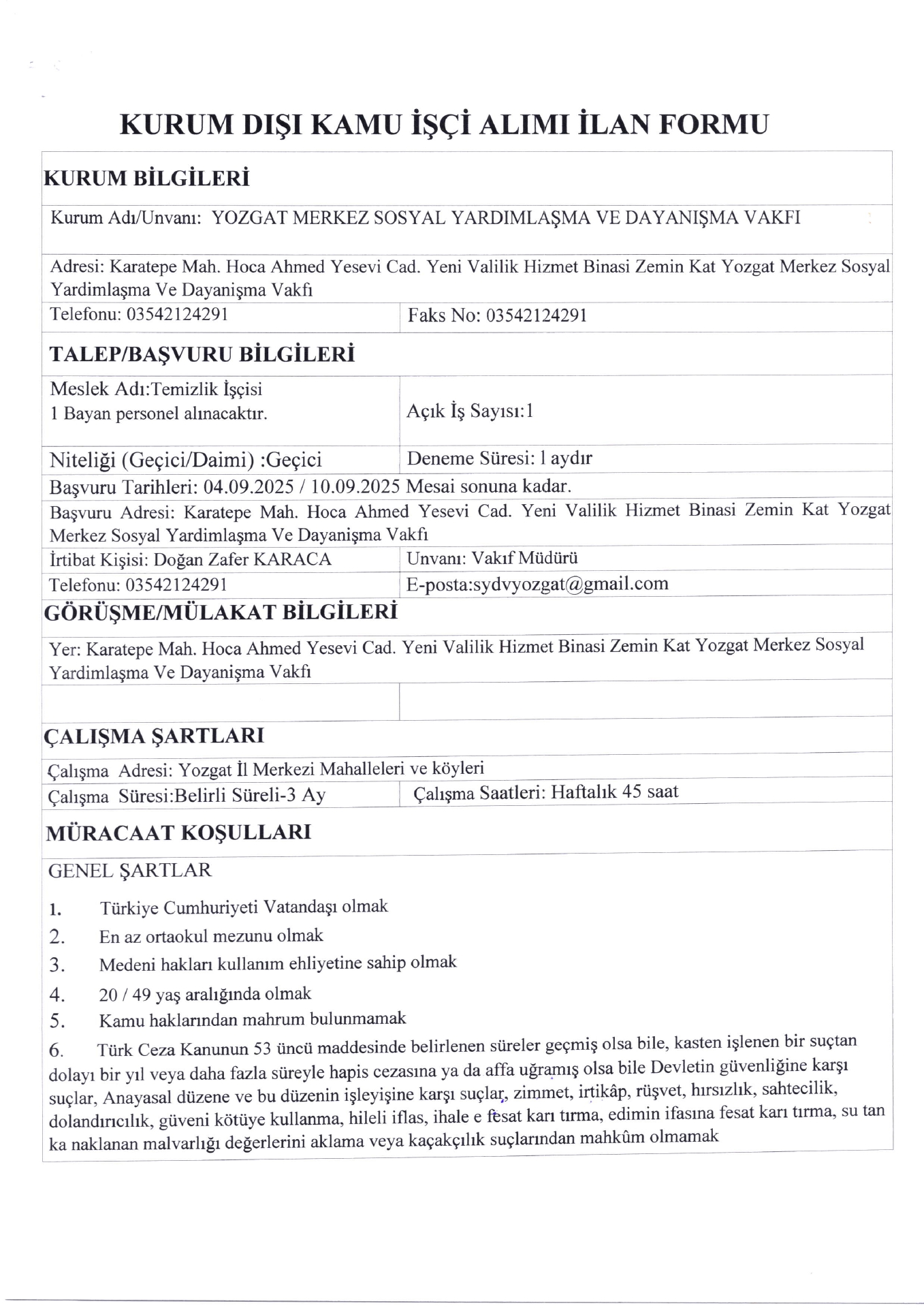 Yozgat Merkez SYDV Geçici 1 İşçi Alacak. Son başvuru tarihi 10 eylül 2025