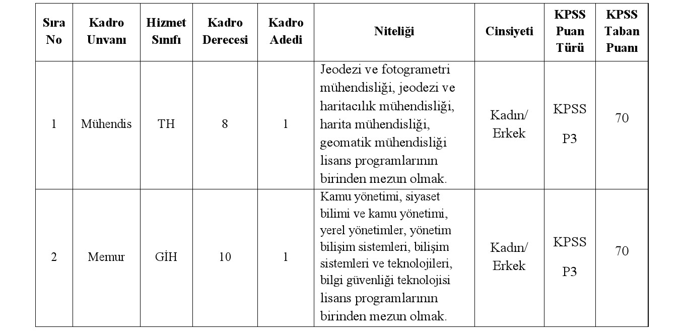 İstanbul ili Adalar Belediye Başkanlığı bünyesinde, 657 sayılı Devlet Memurları Kanununa tabi olarak istihdam edilmek üzere; Mahalli İdarelere İlk Defa Atanacaklara Dair Sınav ve Atama Yönetmeliği hükümlerine göre aşağıda unvanı, sınıfı, derecesi, adedi, nitelikleri, KPSS puan türü, KPSS taban puanı ve diğer şartları taşımak kaydıyla belirtilen boş kadrolara açıktan atama yoluyla memur alınacaktır.
