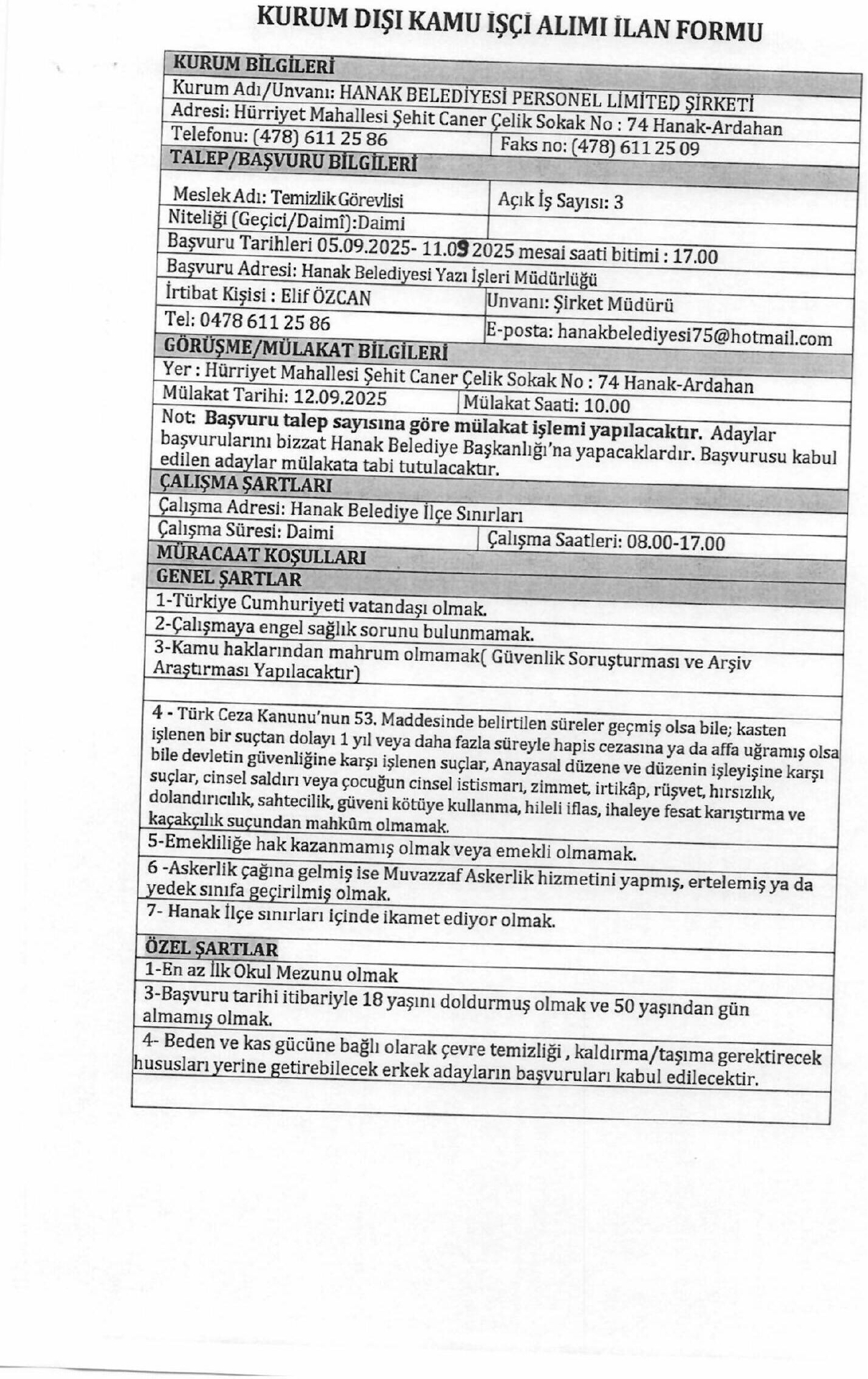 Ardahan Hanak Belediyesi 3 İşçi Alacak. Son başvuru tarihi 11 eylül 2025