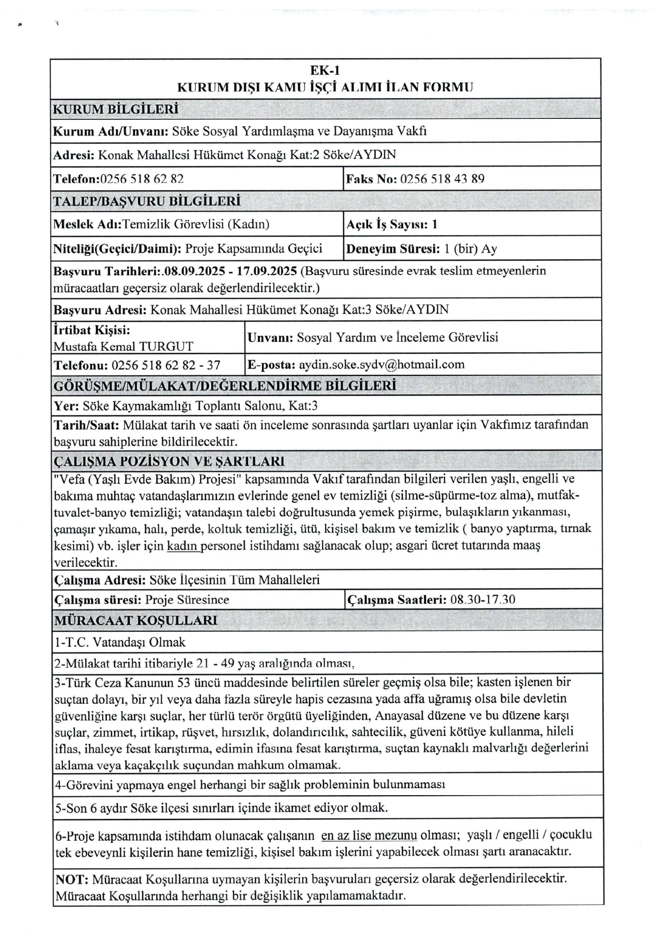 Aydın Söke SYDV Geçici 1 İşçi Alacak. Son başvuru tarihi 17 eylül 2025