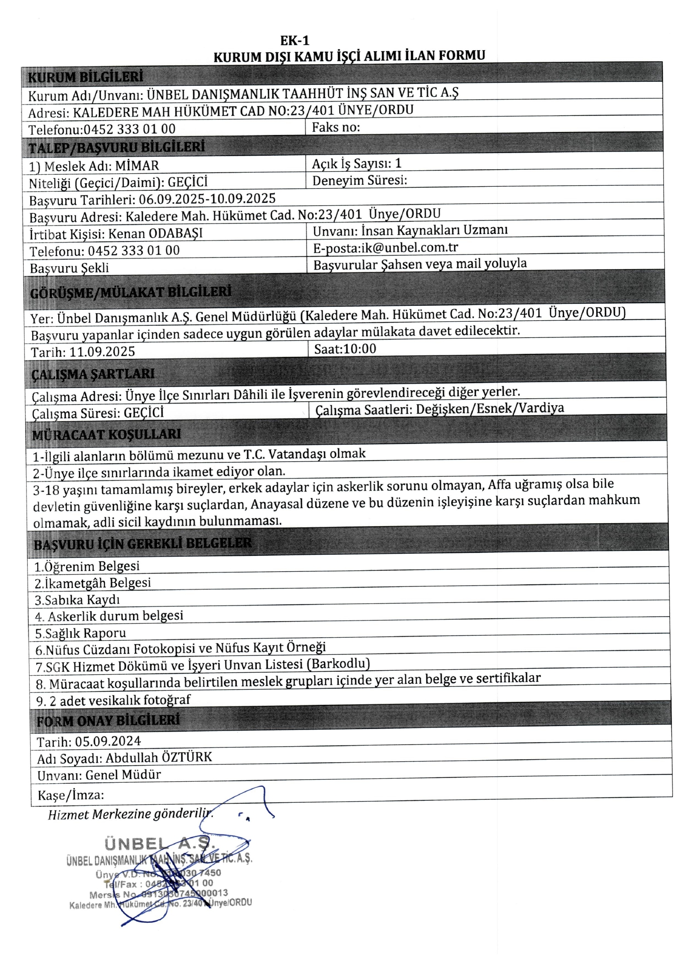 Ordu Ünbel Danışmanlık Geçici 1 İşçi Alacak. Son başvuru tarihi 10 eylül 2025
