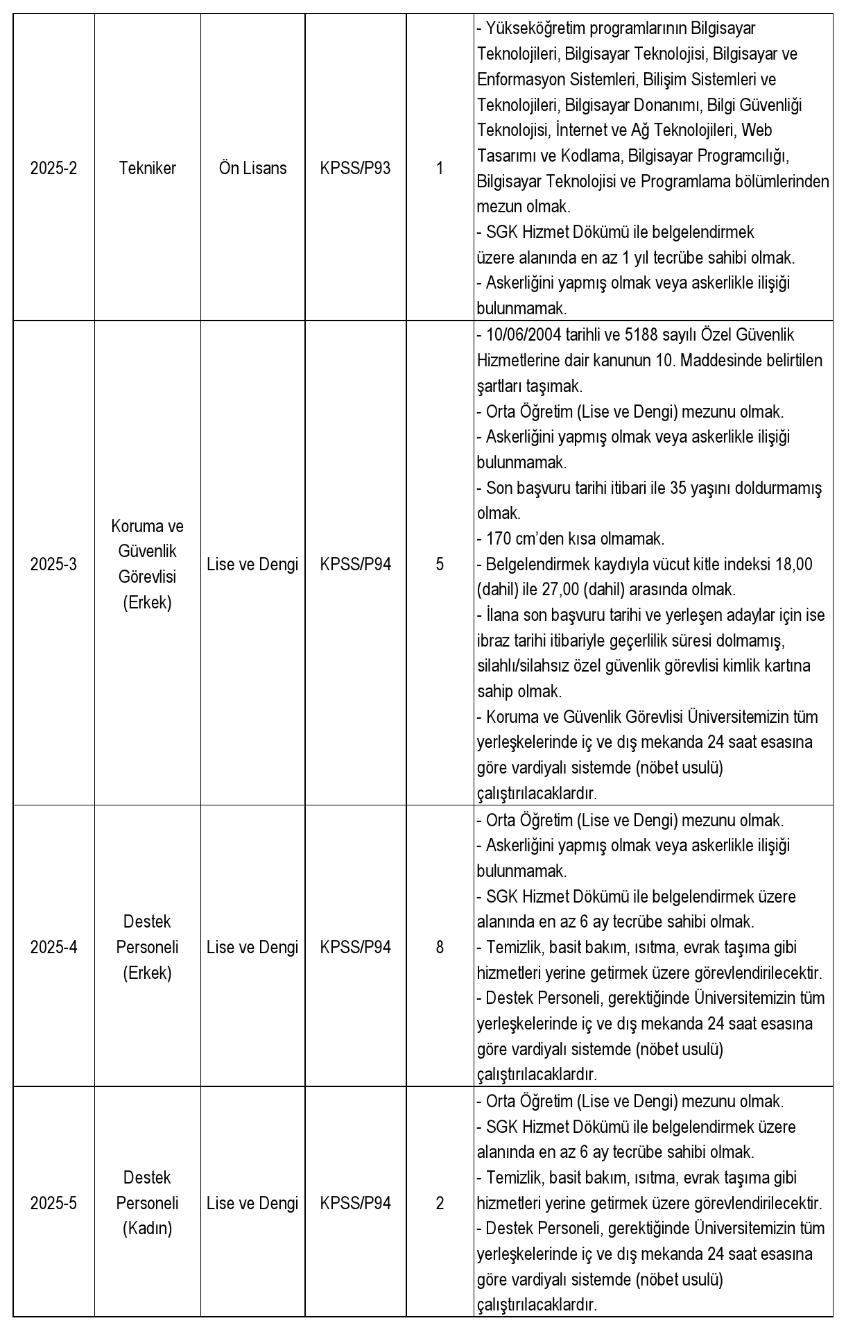 Üniversitemizde 657 sayılı Devlet Memurları Kanunu'nun 4 üncü maddesinin (B) fıkrasına göre Sözleşmeli Personel olarak istihdam edilmek üzere 06.06.1978 tarihli ve 7/15754 sayılı Bakanlar Kurulu Kararı ile yürürlüğe konulan Sözleşmeli Personel Çalıştırılmasına İlişkin Esaslar'ın Ek 2'inci maddesinin (b) fıkrasına göre 2024 KPSS (B) grubu puan sırası esas alınmak suretiyle Sözleşmeli Personel alınacaktır.