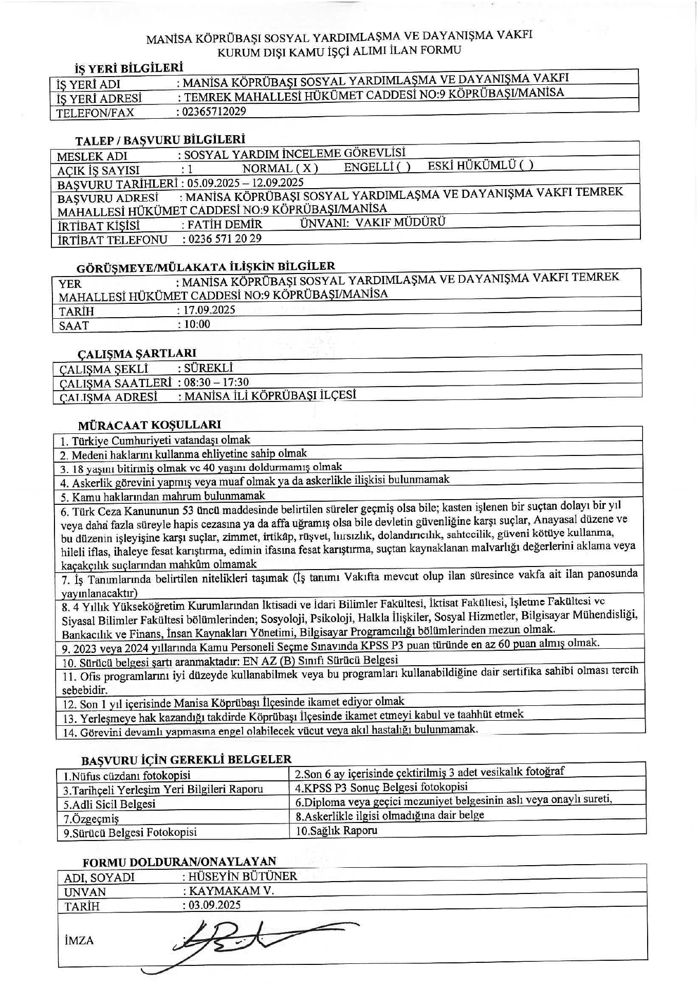 Manisa Köprübaşı SYDV 1 İşçi Alacak. Son başvuru tarihi 12 eylül 2025