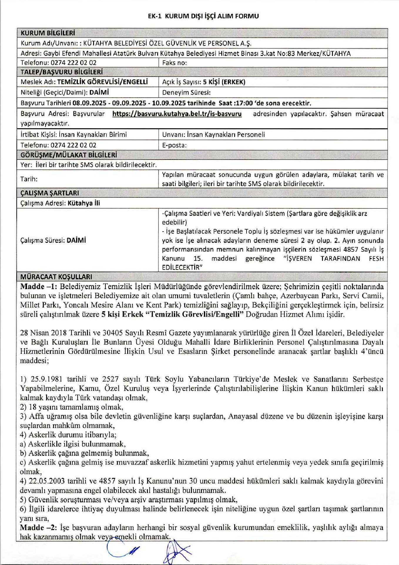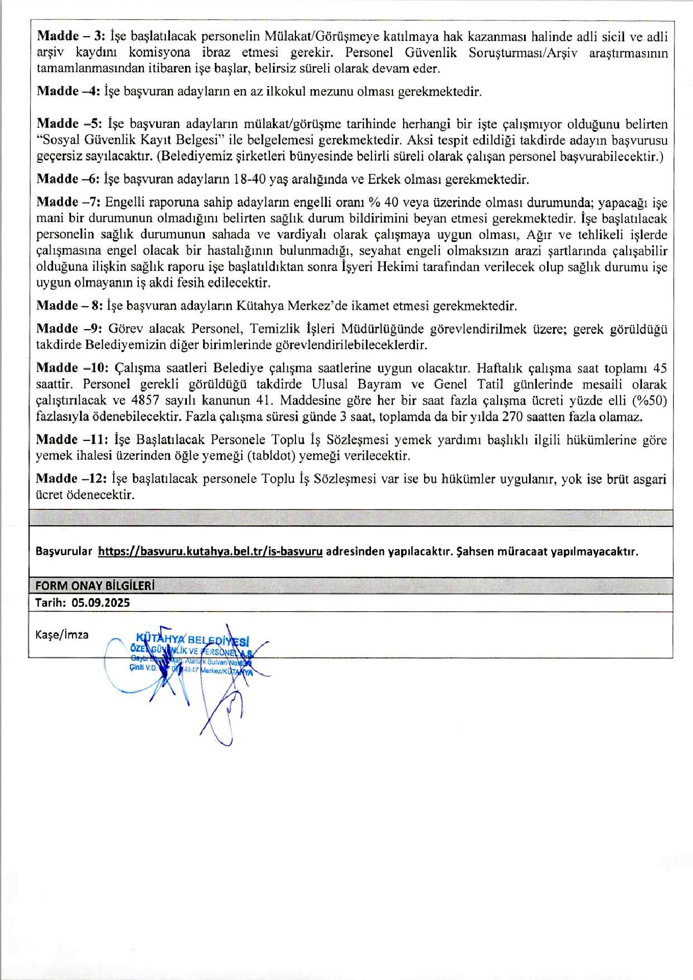 Kütahya Belediyesi 5 İşçi Alacak. Son başvuru tarihi 10 eylül 2025