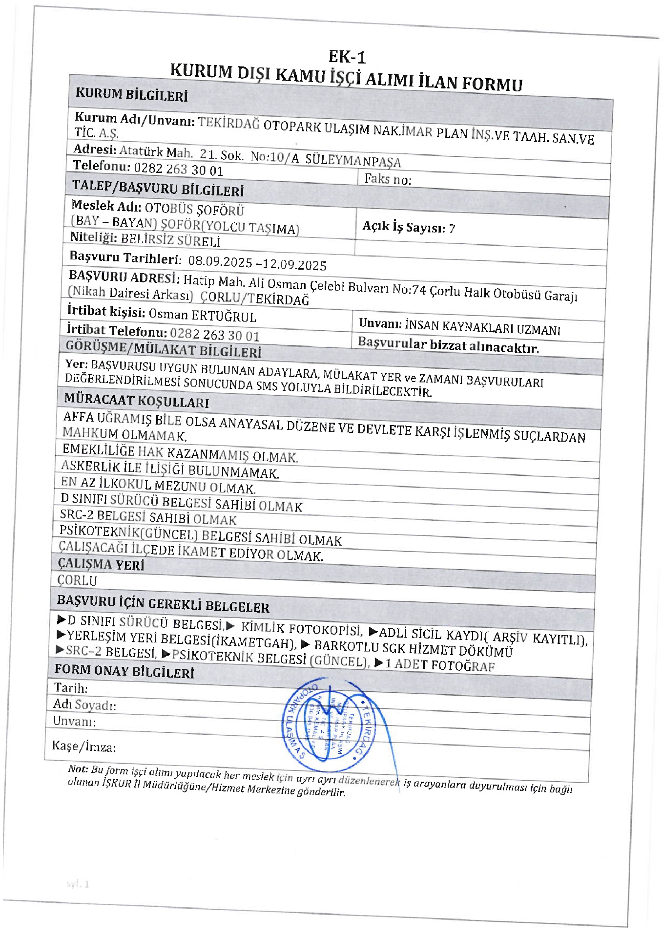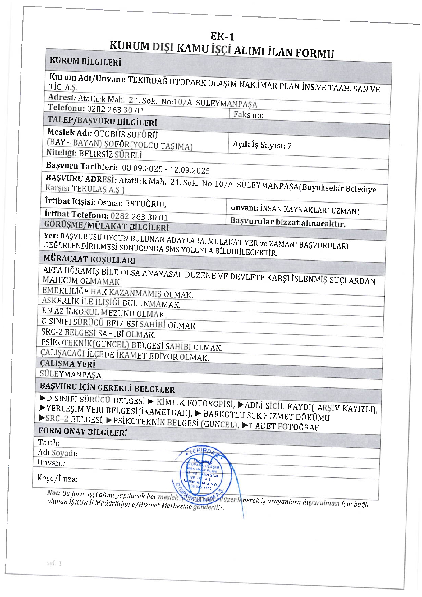 Tekirdağ Otopark Ulaşım 14 İşçi Alacak. Son başvuru tarihi 12 eylül 2025