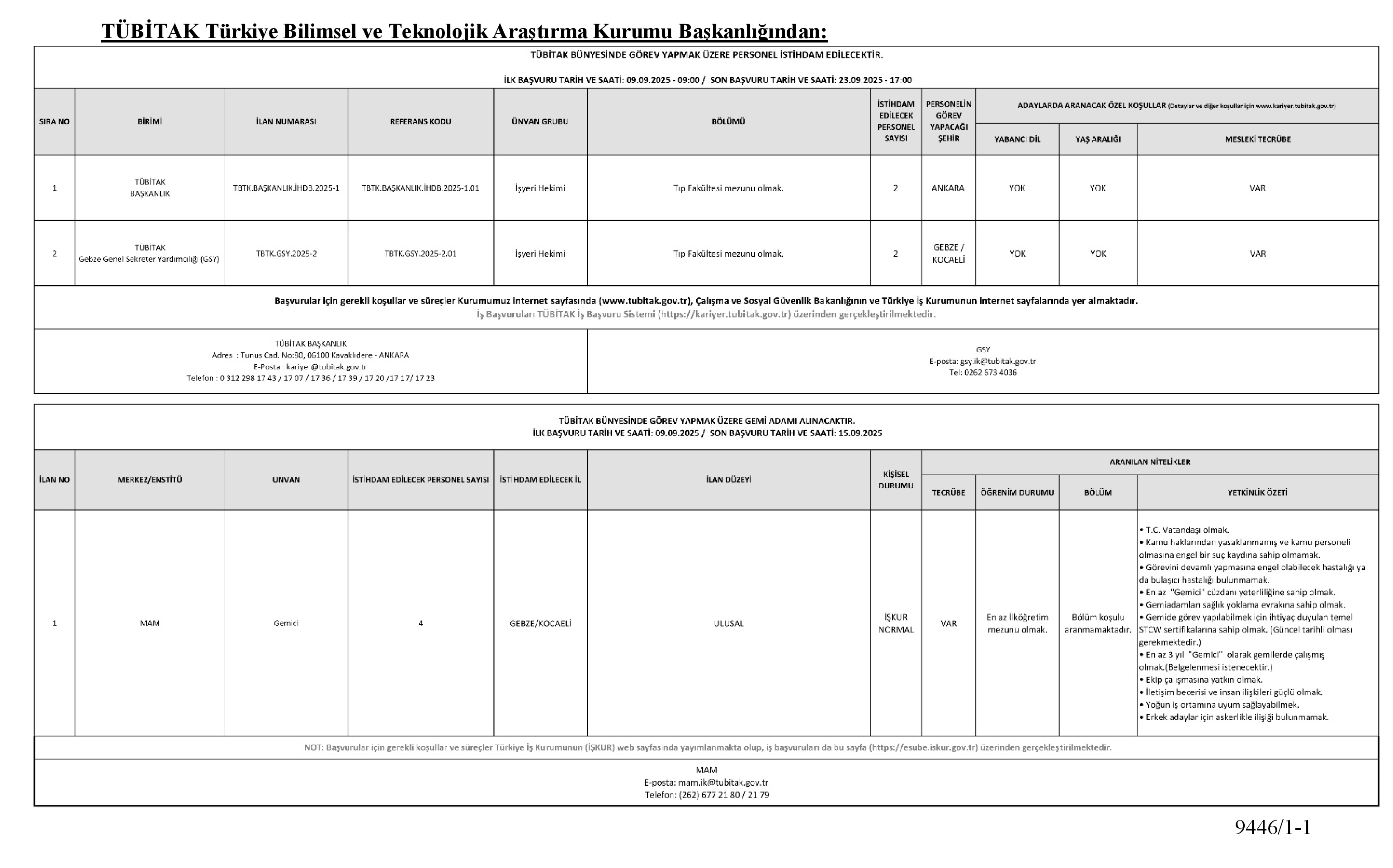 TÜBİTAK, 8 Personel Alacak. Son başvuru tarihi 23 eylül 2025