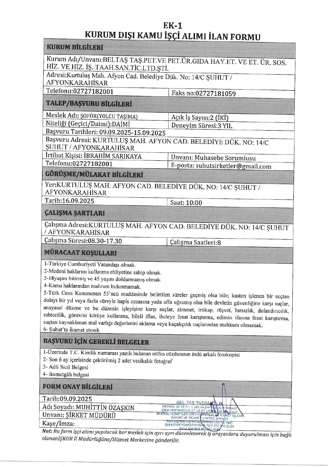 Afyonkarahisar Beltaş 3 İşçi Alacak. Son başvuru tarihi 15 eylül 2025