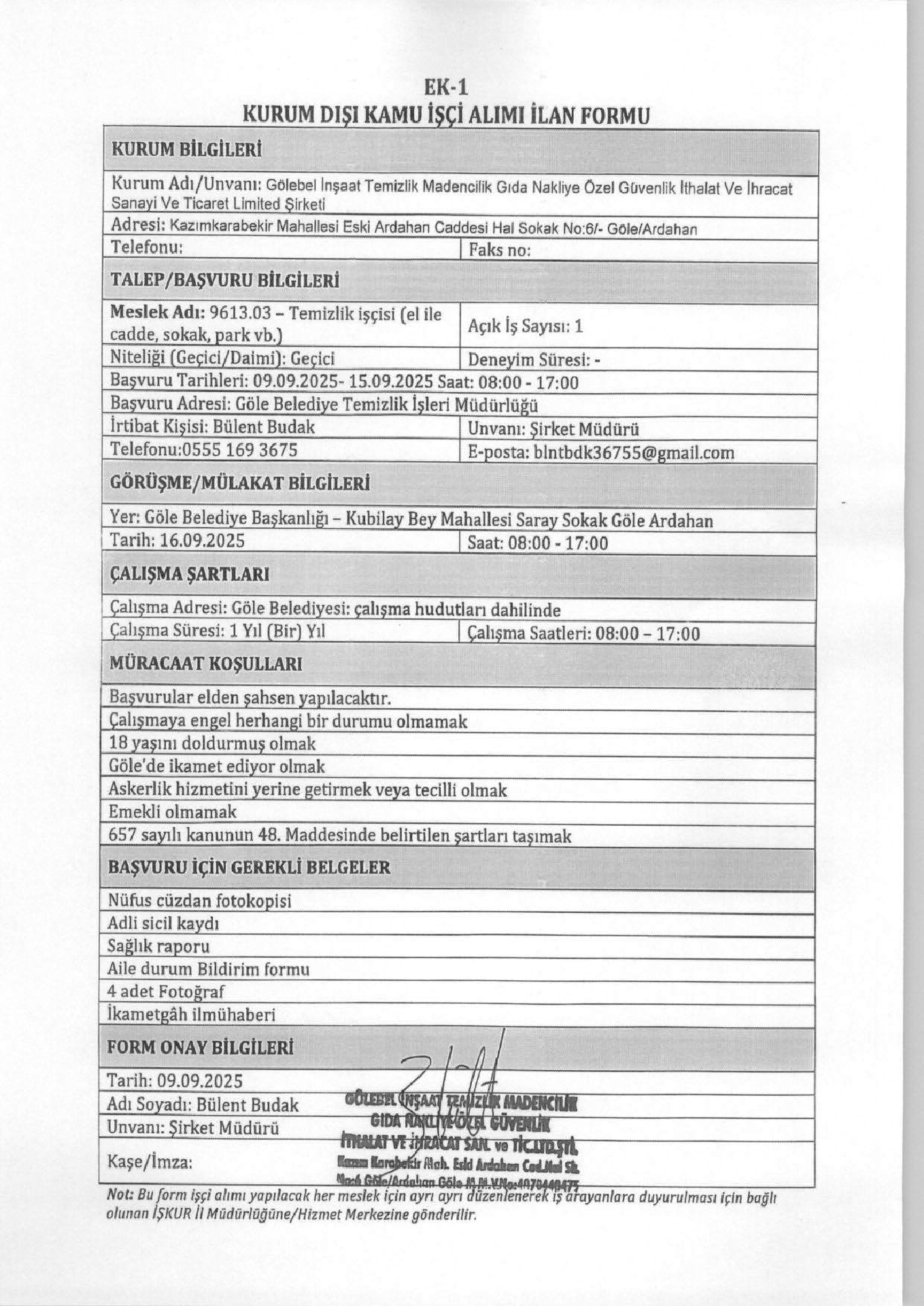 Ardahan Gölebel İnşaat Geçici 1 İşçi Alacak. Son başvuru tarihi 15 eylül 2025