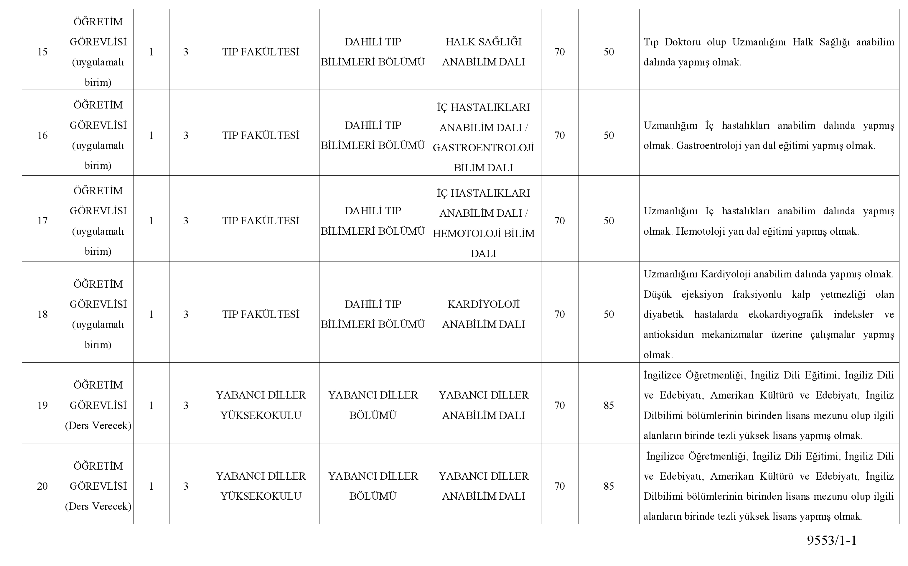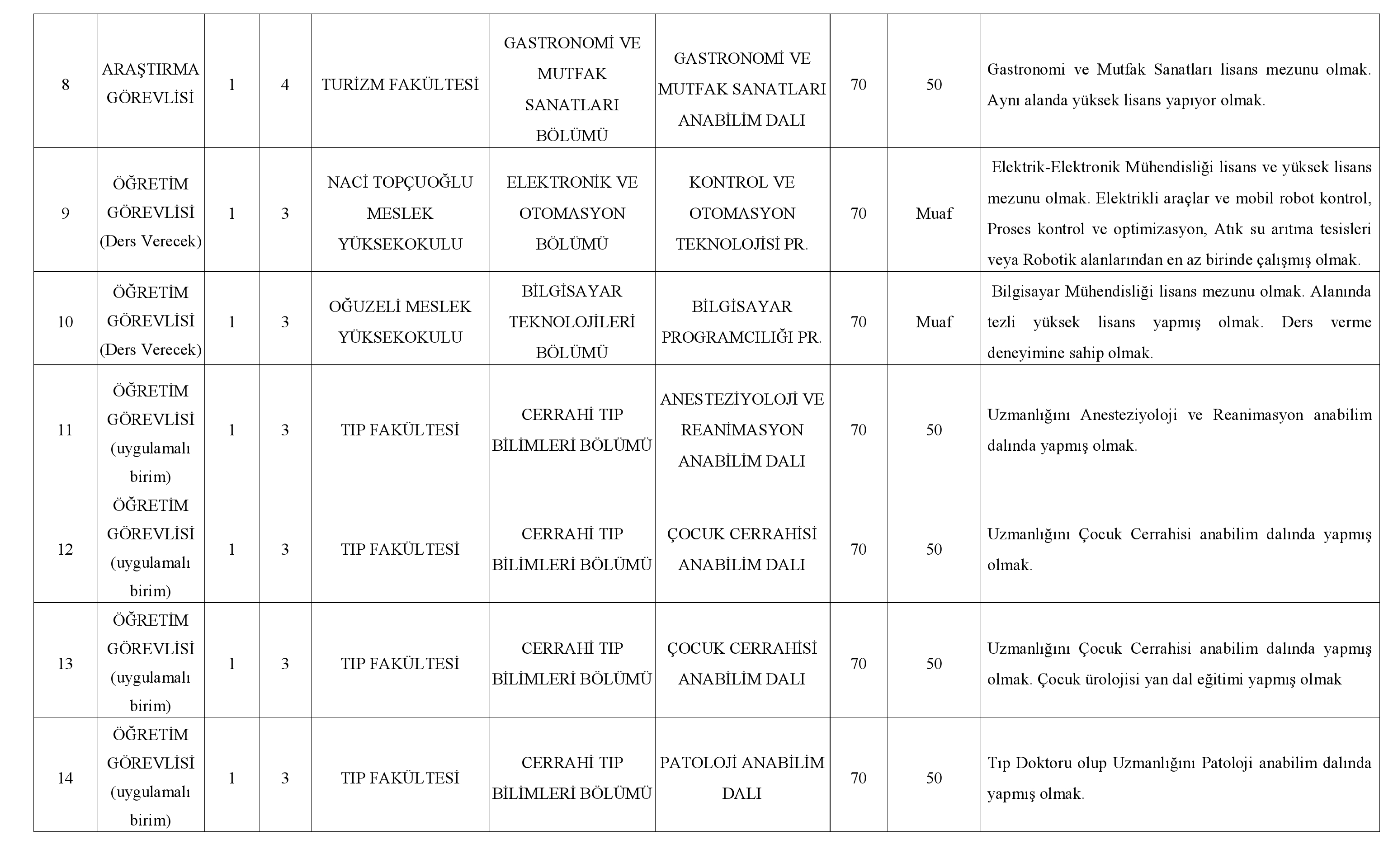 Üniversitemizin aşağıda belirtilen birimlerine; Öğretim Üyesi Dışındaki Öğretim Elemanı Kadrolarına Yapılacak Atamalarda Uygulanacak Merkezi Sınav ile Giriş Sınavlarına İlişkin Usul ve Esaslar Hakkında Yönetmelik, 2547 sayılı Yükseköğretim Kanunu ve 657 sayılı Devlet Memurları Kanunu'nun 48. Maddesi hükümleri uyarınca Öğretim Elemanı alınacaktır.