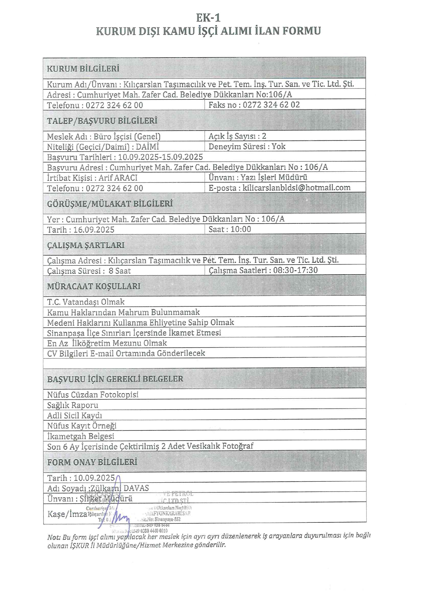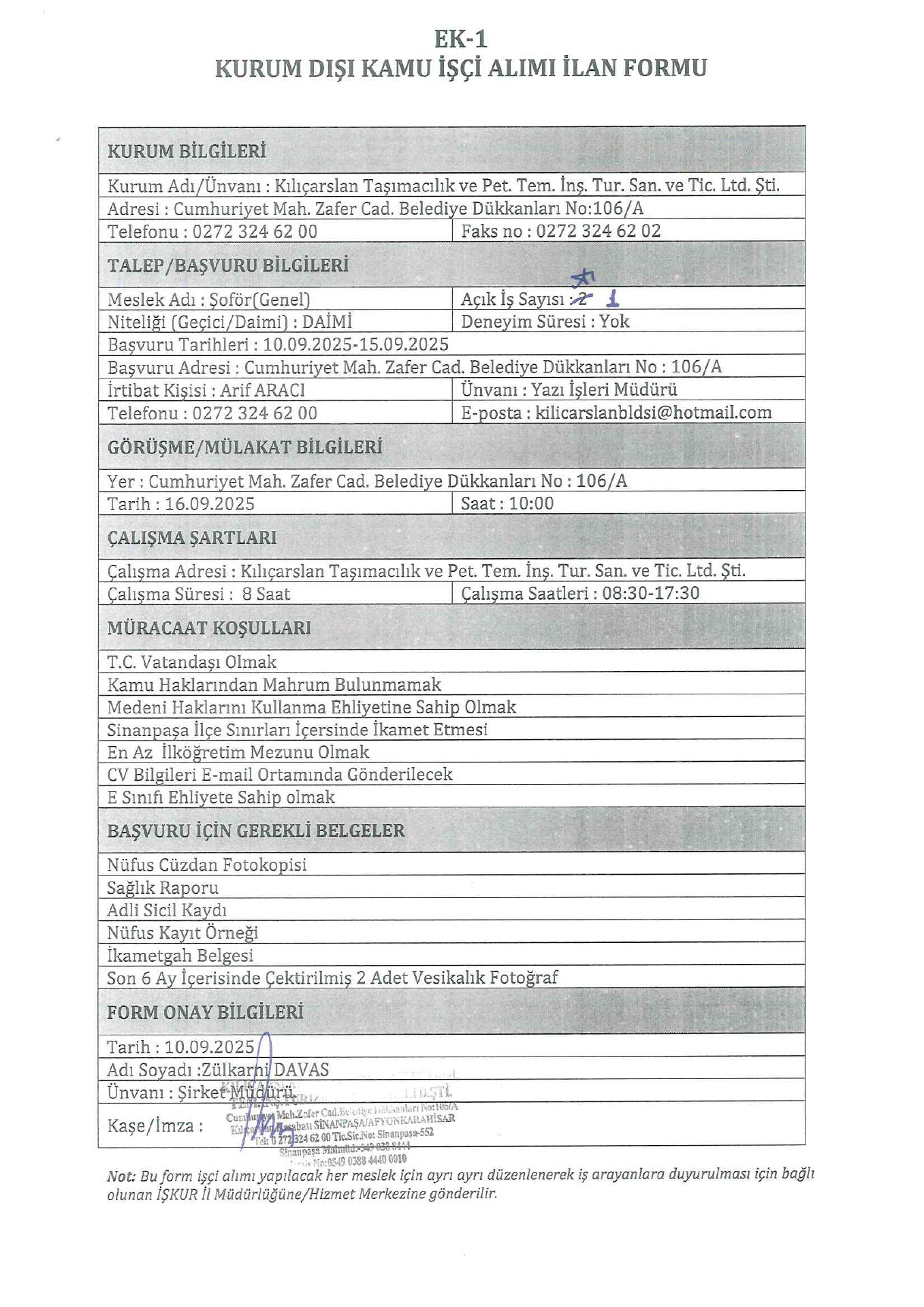 Afyonkarahisar Kılıçarslan Taşımacılık 3 İşçi Alacak. Son başvuru tarihi 15 eylül 2025