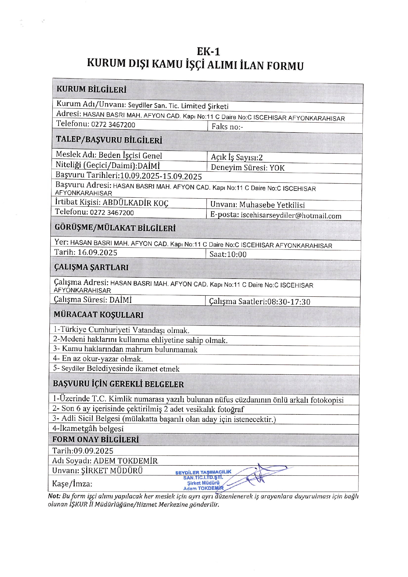 Afyonkarahisar Seydiler Taşımacılık 2 İşçi Alacak. Son başvuru tarihi 15 eylül 2025