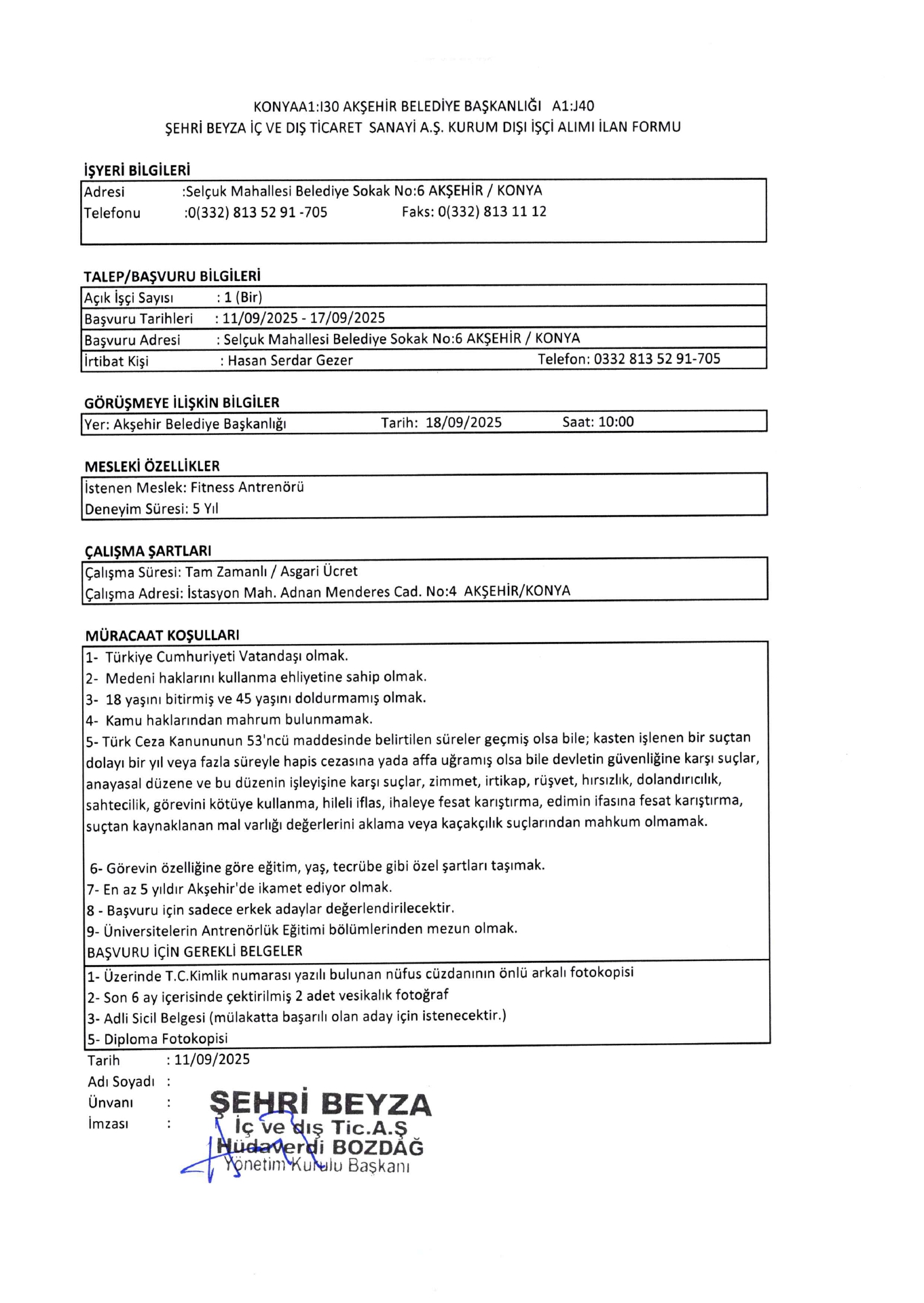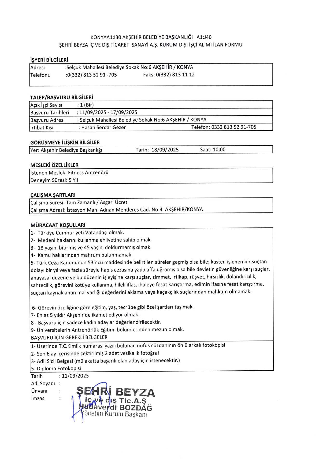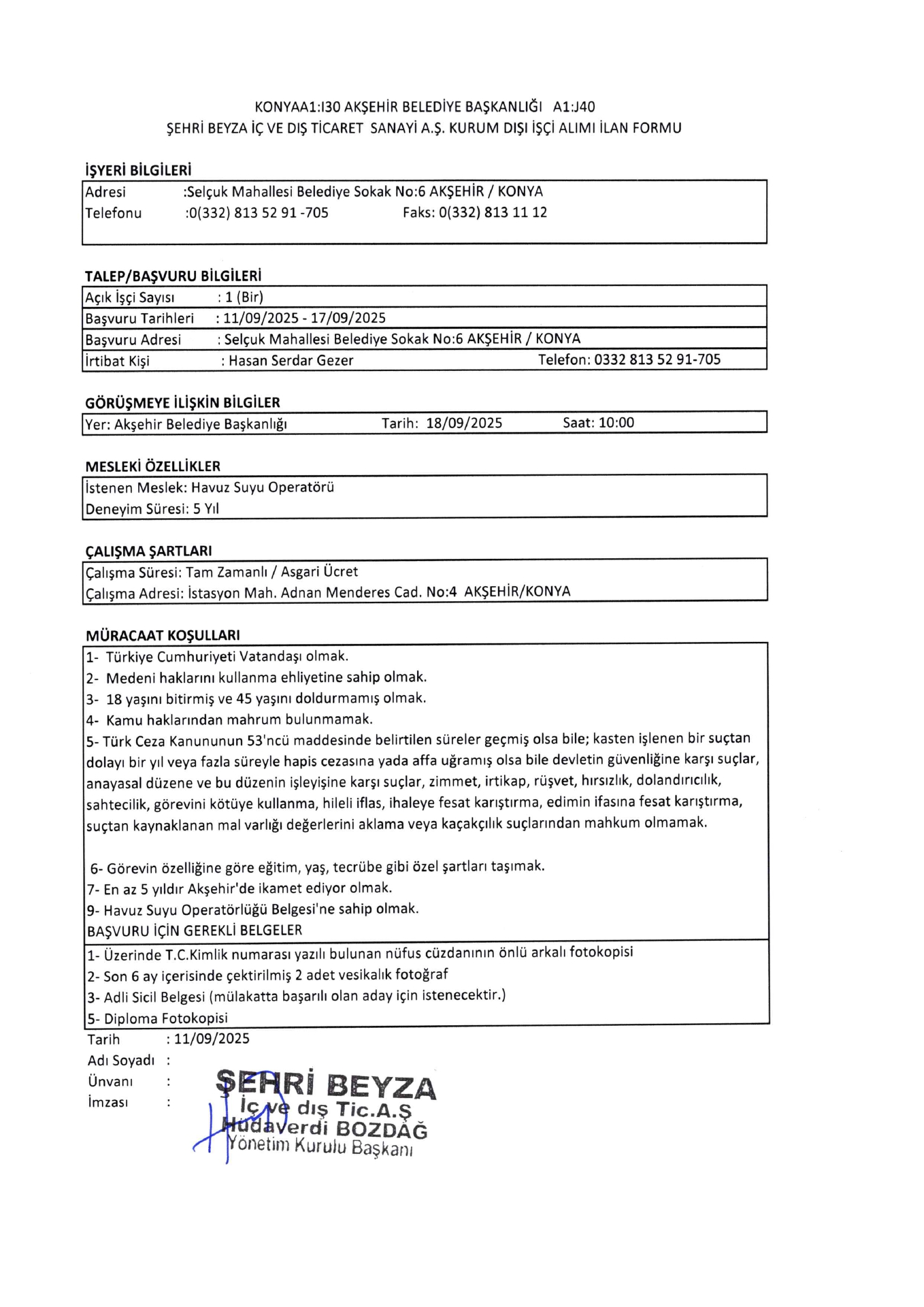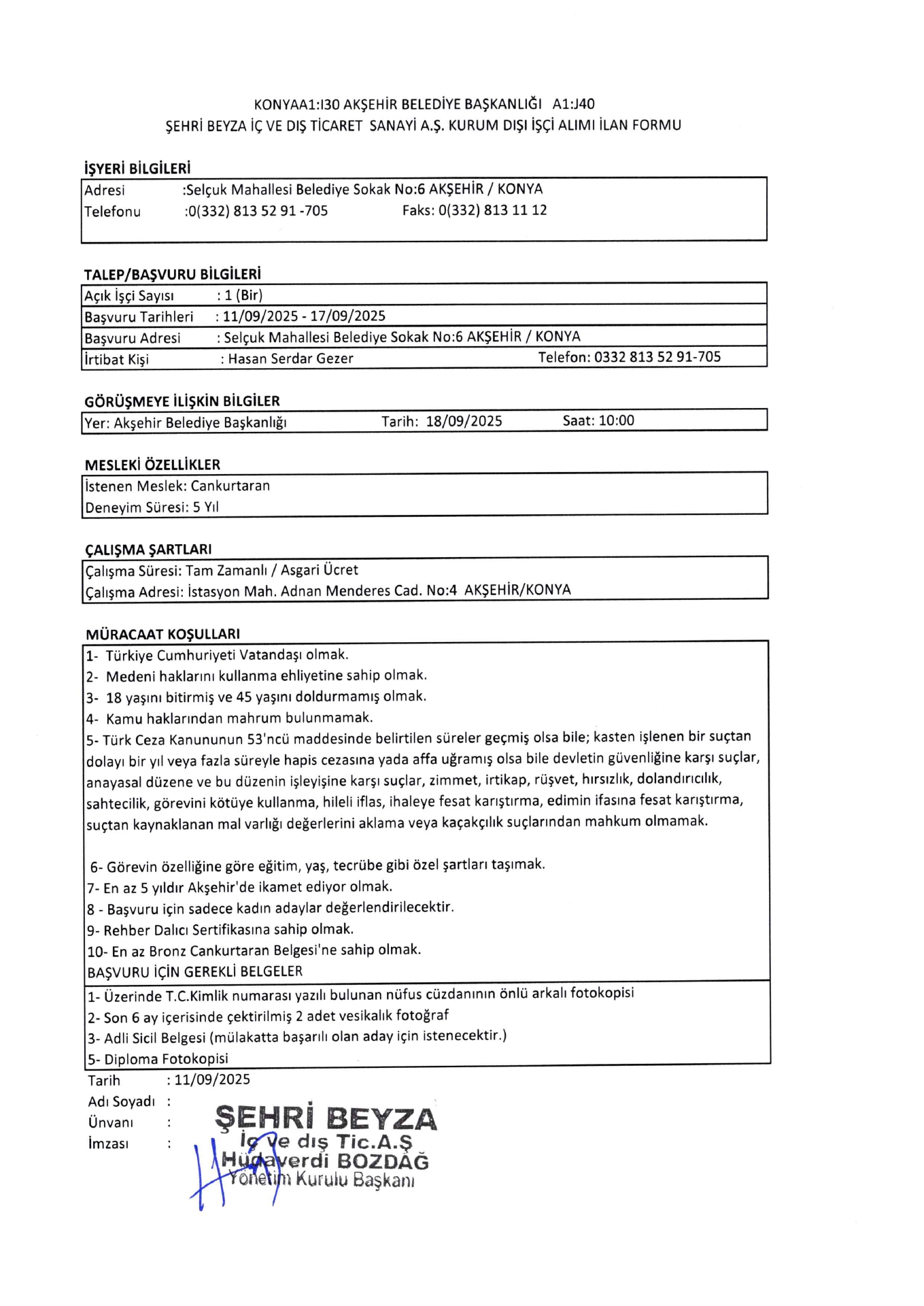 Konya Akşehir Belediyesi 5 İşçi Alacak. Son başvuru tarihi 17 eylül 2025