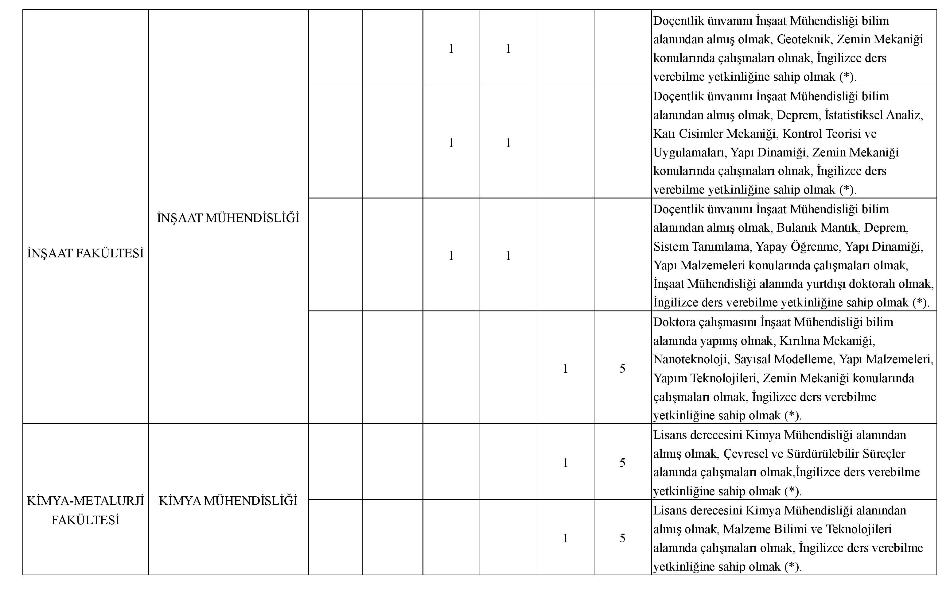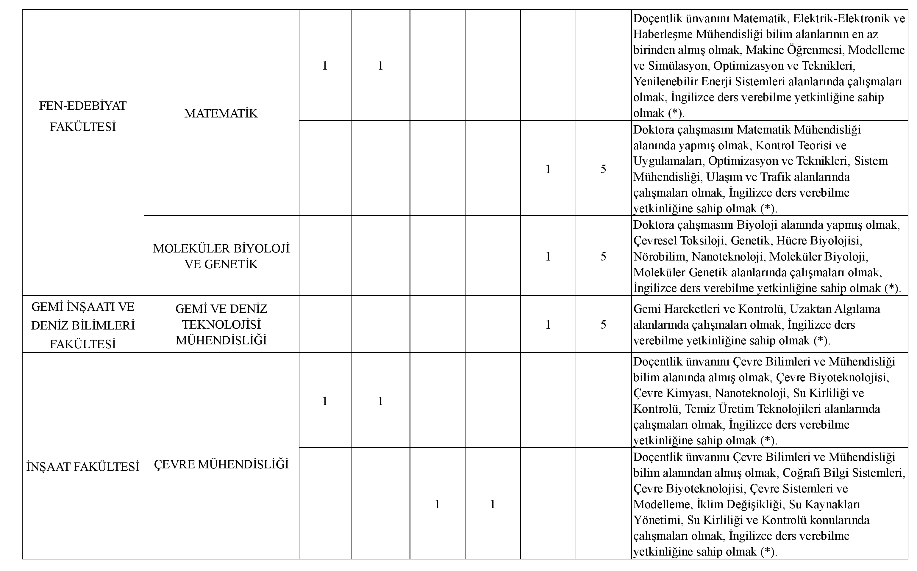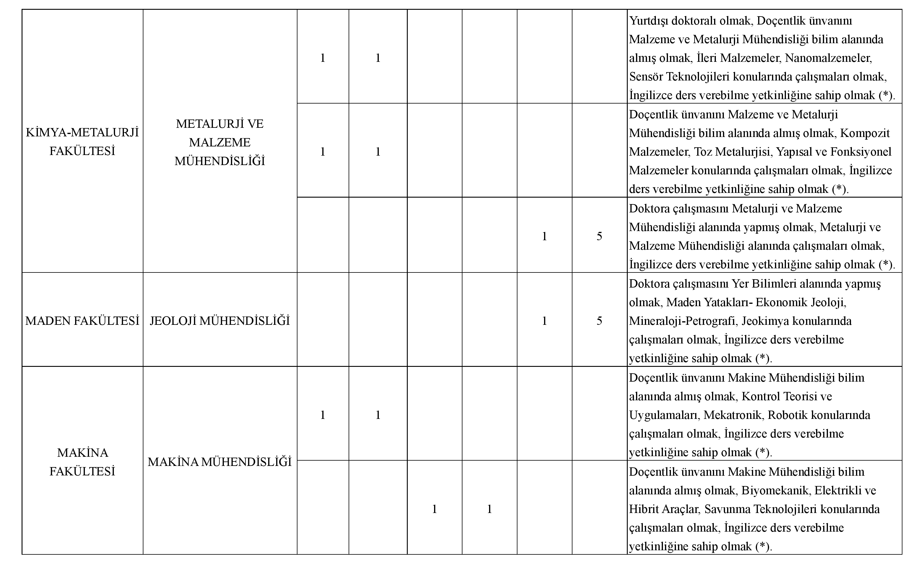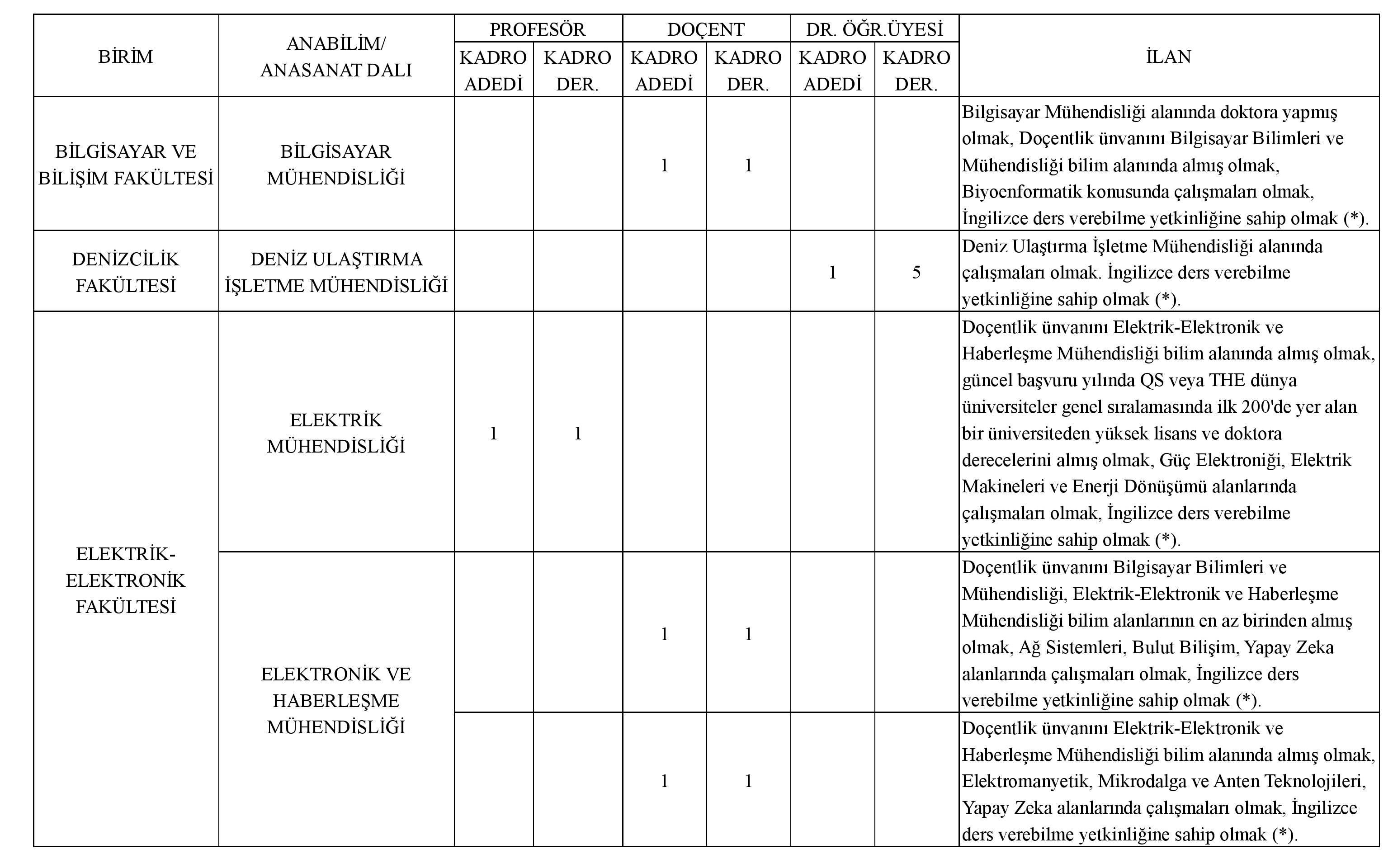 Üniversitemizin aşağıda belirtilen birimlerinde açık bulunan öğretim üyesi kadrolarına, 657 sayılı Kanunun 48. maddesindeki şartları sağlamak kaydıyla, 2547 Sayılı Kanunun 23, 24 ve 26. maddeleri ile Öğretim Üyeliğine Yükseltilme ve Atanma Yönetmeliği ve İTÜ Akademik Yükseltme ve Atama Ölçütleri Senato Esasları (2022) uyarınca öğretim üyeleri alınacaktır.