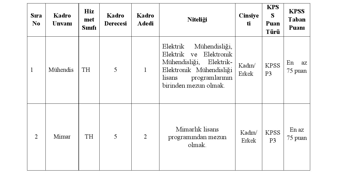Konya ili Karatay Belediye Başkanlığı bünyesinde, 657 sayılı Devlet Memurları Kanununa tabi olarak istihdam edilmek üzere; Mahalli İdarelere İlk Defa Atanacaklara Dair Sınav ve Atama Yönetmeliği hükümlerine göre aşağıda unvanı, sınıfı, derecesi, adedi, nitelikleri, KPSS puan türü, KPSS taban puanı ve diğer şartları taşımak kaydıyla belirtilen boş kadrolara açıktan atama yoluyla memur alınacaktır.