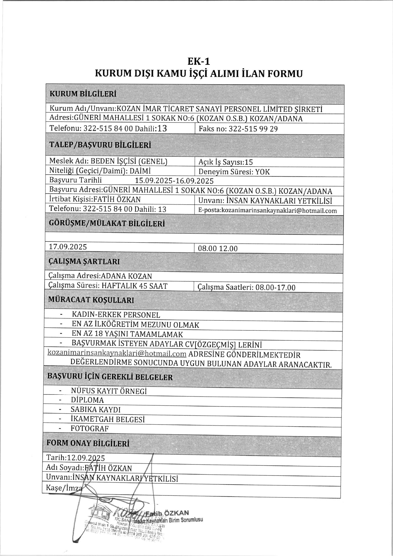 Adana Kozan İmar 15 İşçi Alacak. Son başvuru tarihi 16 eylül 2025