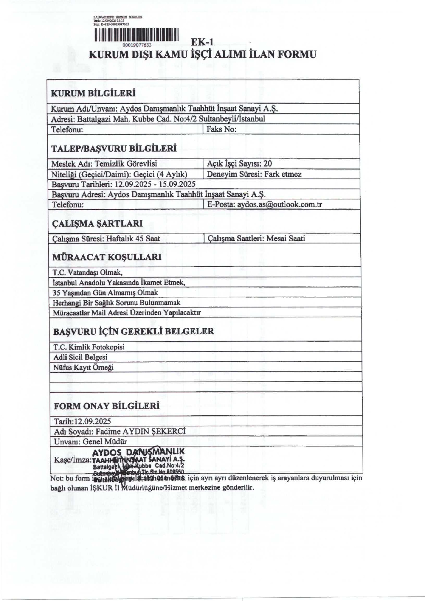 İstanbul Aydos Danışmanlık Geçici 20 İşçi Alacak. Son başvuru tarihi 15 eylül 2025