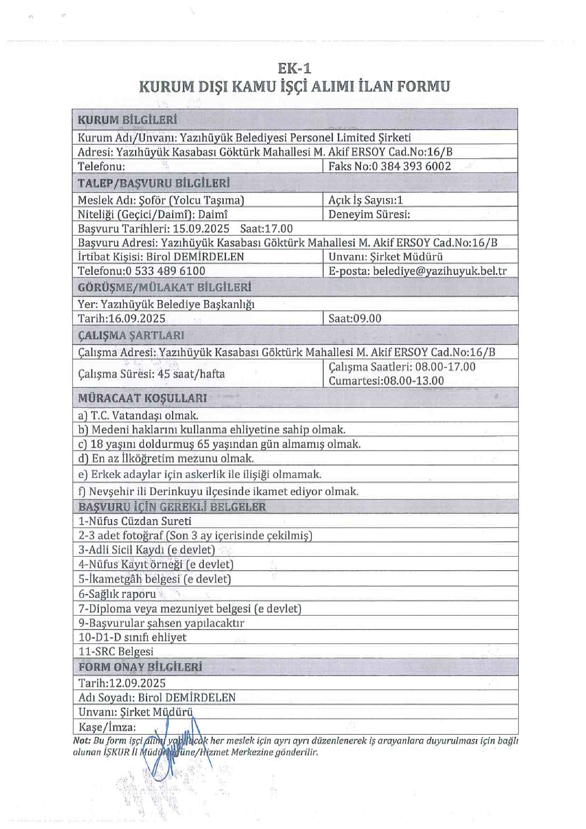 Nevşehir Belediyesi 1 İşçi Alacak. Son başvuru tarihi 15 eylül 2025
