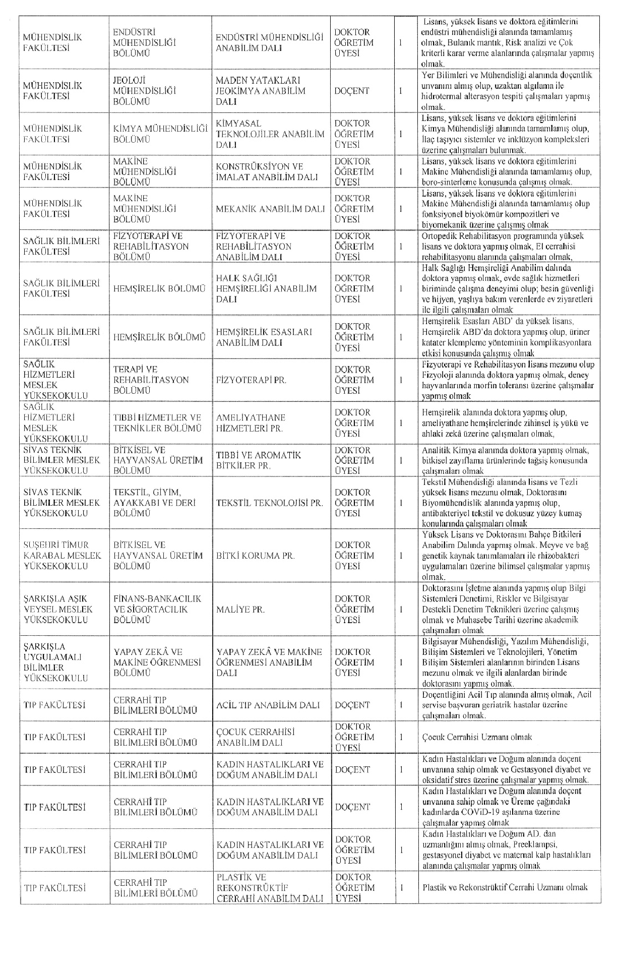 Sivas Cumhuriyet Üniversitesi Öğretim Üyesi Alım İlanı. Son başvuru tarihi 27 eylül 2025