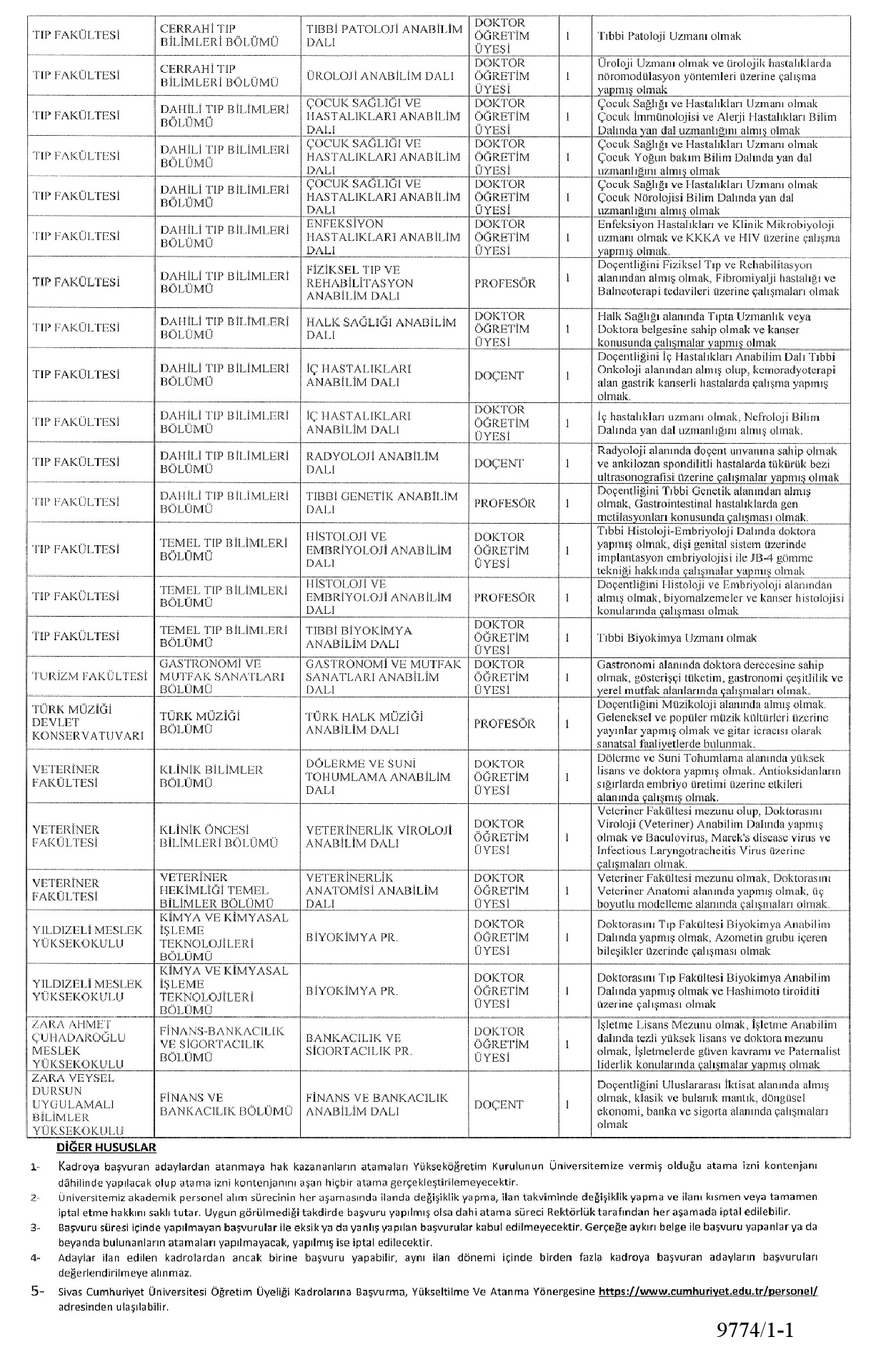 Adayların Üniversitemiz web sitesinde yayınlanan T.C Sivas Cumhuriyet Üniversitesi Öğretim Üyeliği Kadrolarına Başvurma, Yükseltilme ve Atanına Yönergesi Koşullarını sağlıyor olmaları gerekmektedir.
