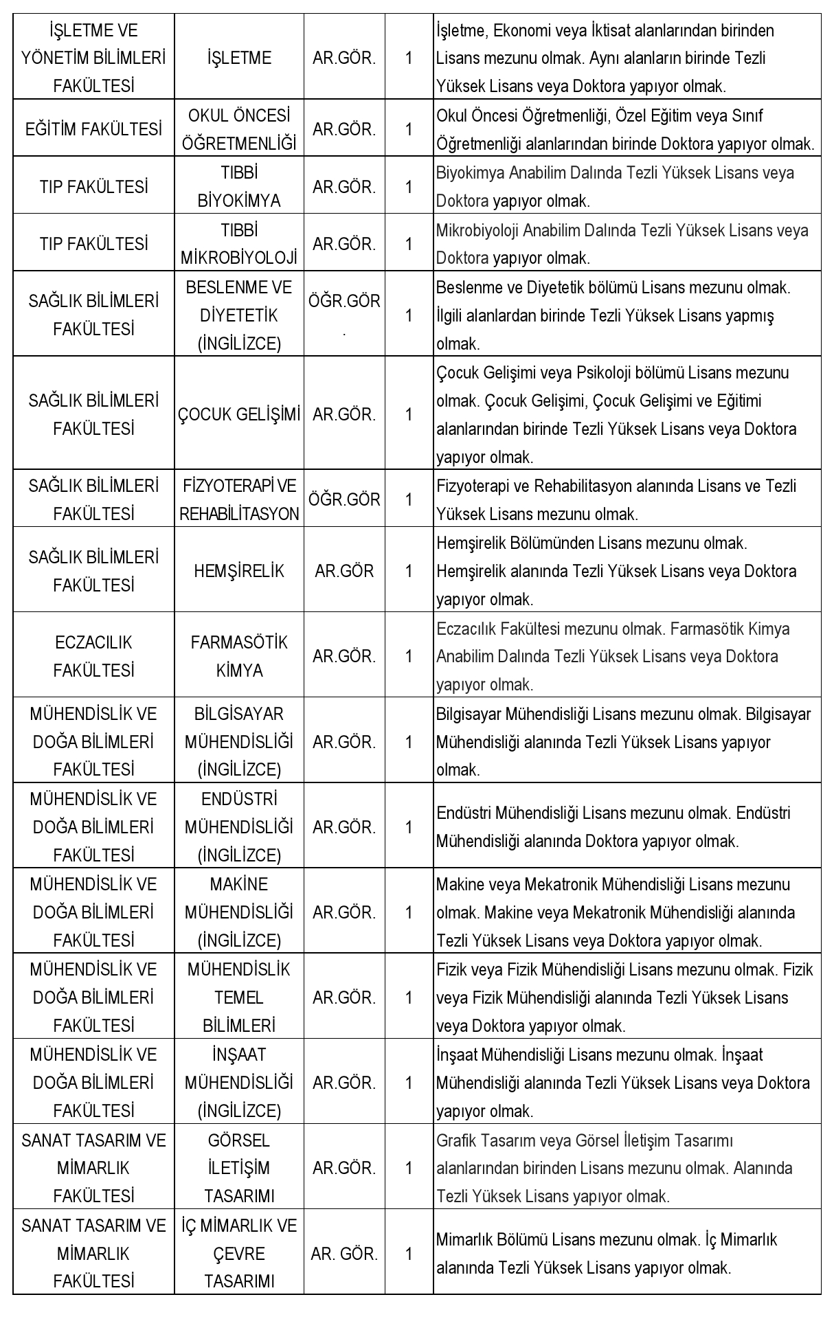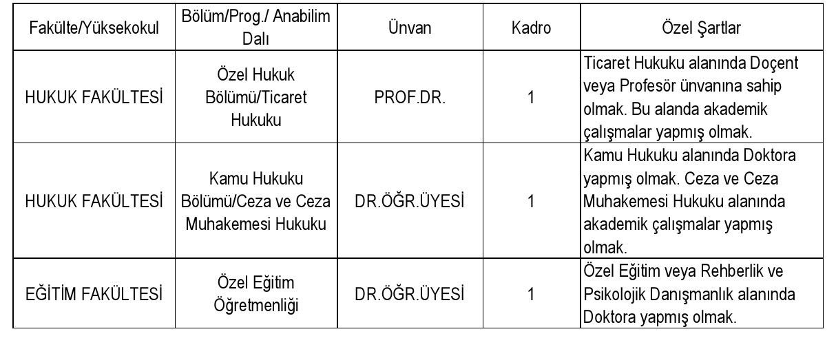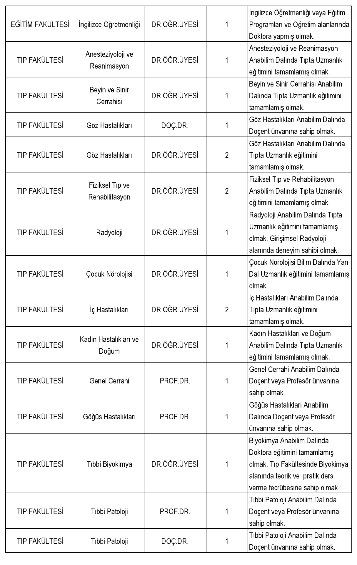 Üniversitemize 2547 sayılı Yükseköğretim Kanunu ve 12.06.2018 tarih ve 30449 sayılı Resmi Gazete'de yayımlanarak yürürlüğe giren "Öğretim Üyeliği Yükseltilme ve Atanma Yönetmeliği'nin" ilgili maddeleri uyarınca aşağıda nitelikleri belirtilen kadrolara Öğretim Üyeleri alınacaktır.