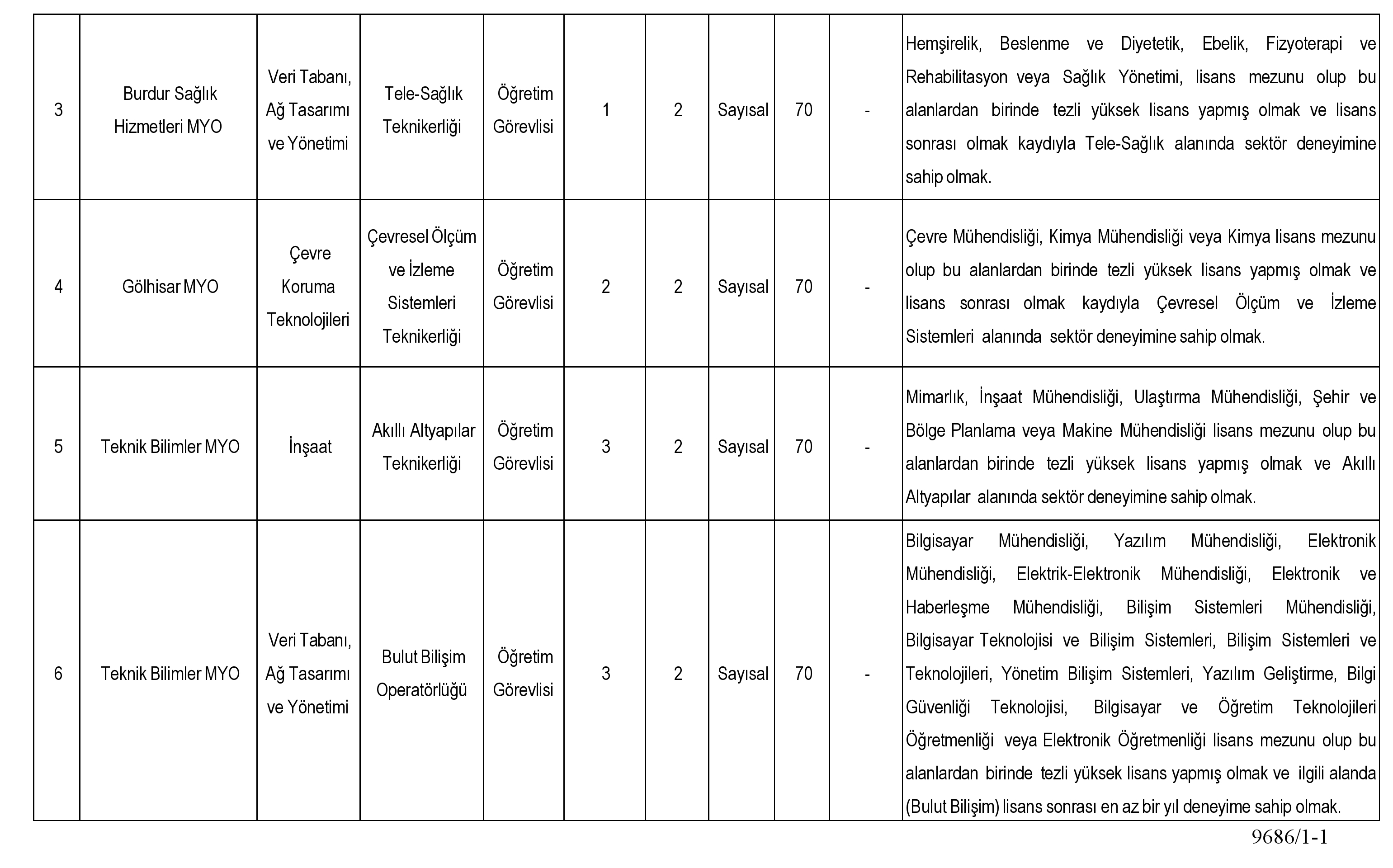 5.sırada yer alan Akıllı Altyapılar Teknikerliği Programında, "Mimarlık, İnşaat Mühendisliği, Ulaştırma Mühendisliği, Şehir ve Bölge Planlama veya Makine Mühendisliği lisans mezunu olup bu alanlardan birinde tezli yüksek lisans yapmış olmak, Akıllı Altyapılar alanında sektör deneyimine sahip olmak." olan ilan özel şartı "lisans sonrası olmak kaydıyla" ibaresi eklenerek "Mimarlık, İnşaat Mühendisliği, Ulaştırma Mühendisliği, Şehir ve Bölge Planlama veya Makine Mühendisliği lisans mezunu olup bu alanlardan birinde tezli yüksek lisans yapmış olmak ve lisans sonrası olmak kaydıyla Akıllı Altyapılar alanında sektör deneyimine sahip olmak." şeklinde düzeltilmiştir.