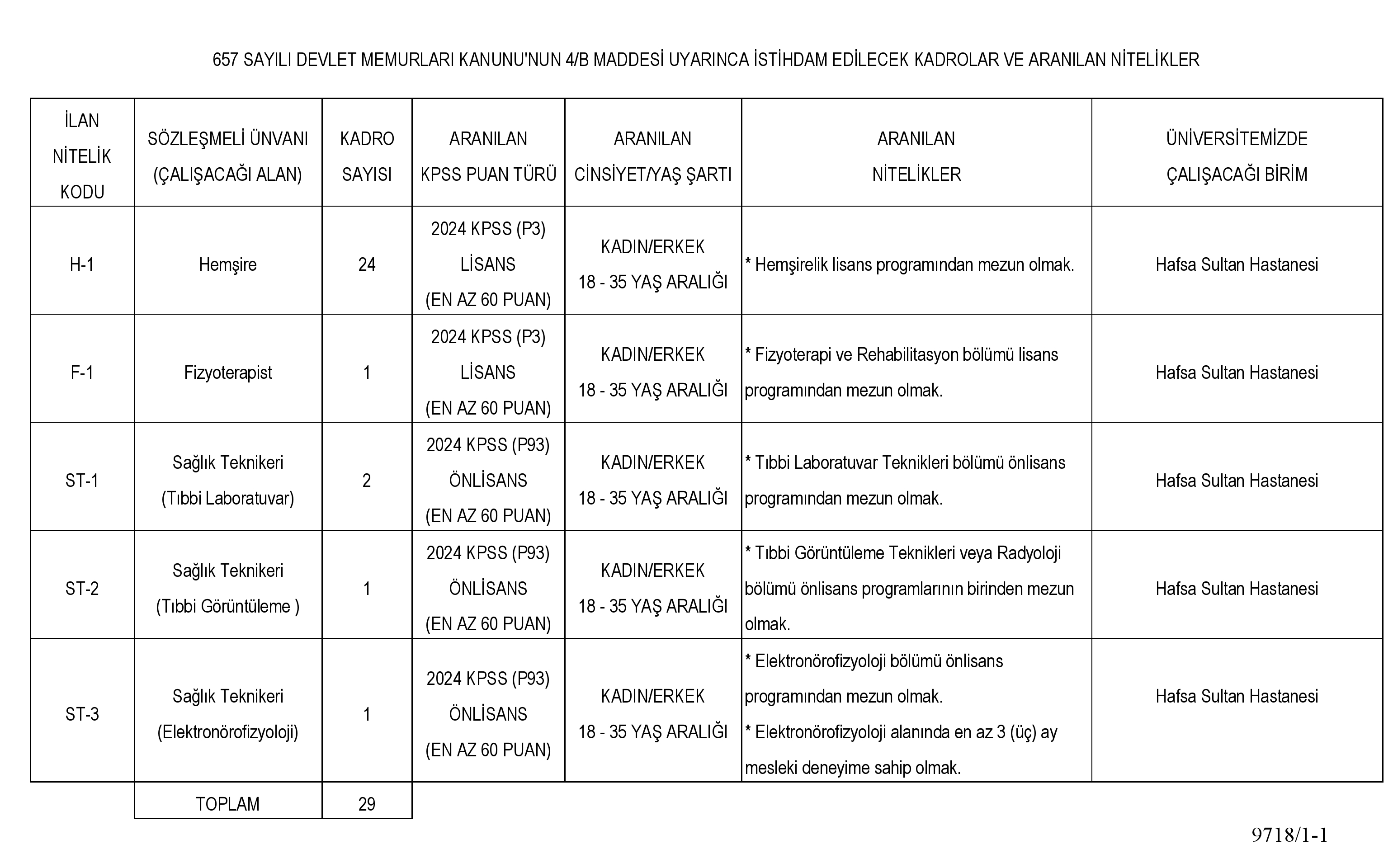657 sayılı Devlet Memurları Kanunu'nun 4. maddesinin (B) fıkrasına göre istihdam edilmek ve giderleri özel bütçeden karşılanmak üzere 06.06.1978 tarihli ve 7/15754 sayılı Kararnameye ekli 28.06.2007 tarihli ve 26566 sayılı Resmi Gazete'de yayınlanan Sözleşmeli Personel Çalıştırılmasına İlişkin Esaslarda Değişiklik Yapılmasına Dair Esaslarda yer alan ek 2'nci maddenin (b) fıkrasına göre 2024 KPSS (B) grubu puan sıralaması esas alınmak suretiyle ekli listede belirtilen pozisyonlarda toplam 29 (yirmi dokuz) adet sözleşmeli personel alınacaktır.