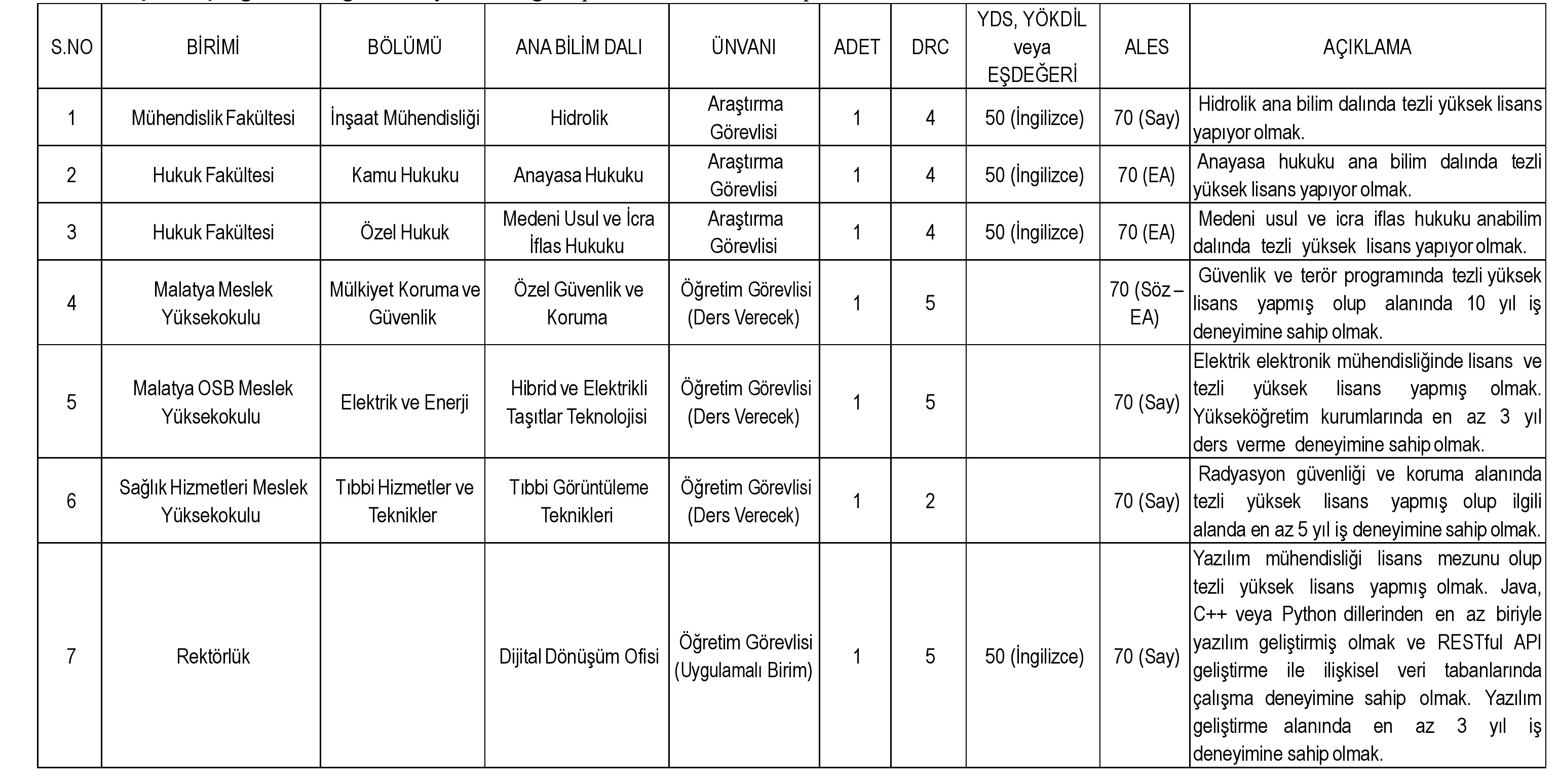Üniversitemizin aşağıda belirtilen birimlerine; Öğretim Üyesi Dışındaki Öğretim Elemanı Kadrolarına Yapılacak Atamalarda Uygulanacak Merkezi Sınav ile Giriş Sınavlarına İlişkin Usul ve Esaslar Hakkında Yönetmelik hükümleri uyarınca Öğretim Görevlisi kadrosuna başvuranlar 2547 sayılı Yükseköğretim Kanunu'nun 31. maddesi, Araştırma Görevlisi kadrosuna başvuranlar ise aynı Kanunun 50/d maddesi kapsamında ve 657 sayılı Devlet Memurları Kanunu'nun 48. maddesi hükümleri uyarınca alınacaktır.