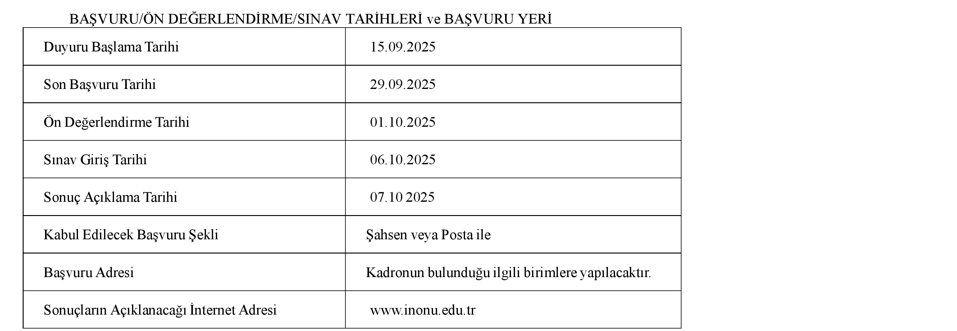 Başvuru için gerekli belgeler ve ayrıntılı bilgi https://www.inonu.edu.tr/personeldb/ adresinde mevcuttur.