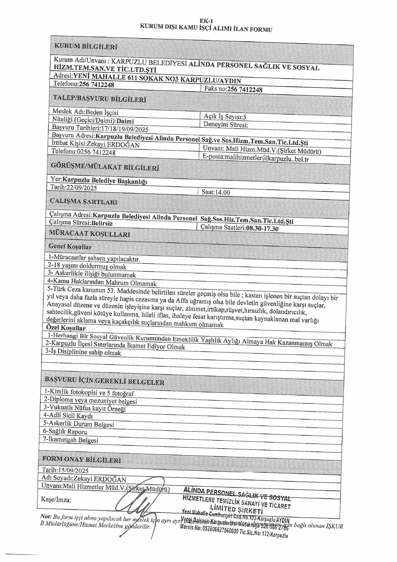 Aydın Karpuzlu Belediyesi 5 İşçi Alacak. Son başvuru tarihi 19 eylül 2025