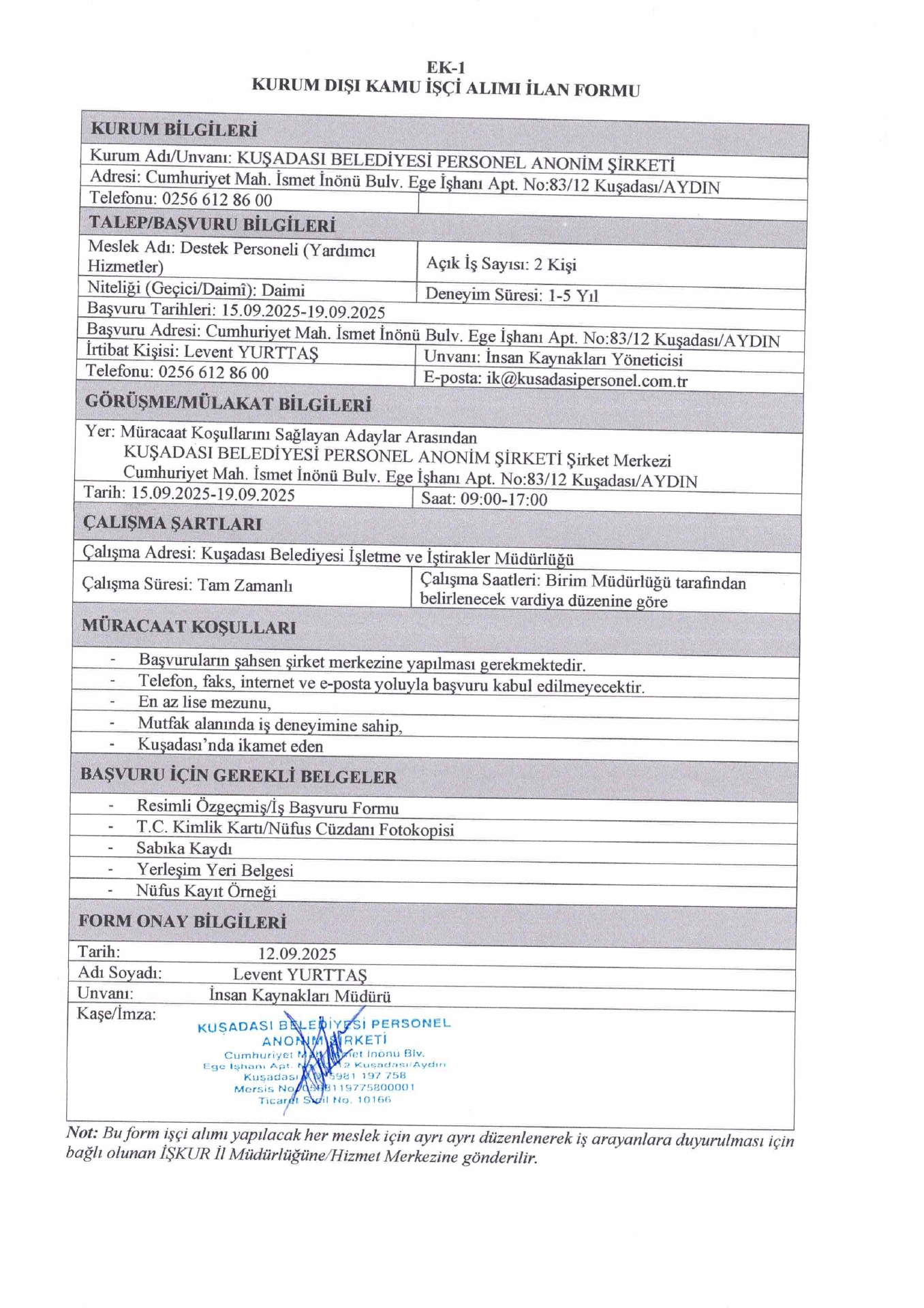 Aydın Kuşadası Belediyesi 2 İşçi Alacak. Son başvuru tarihi 19 eylül 2025