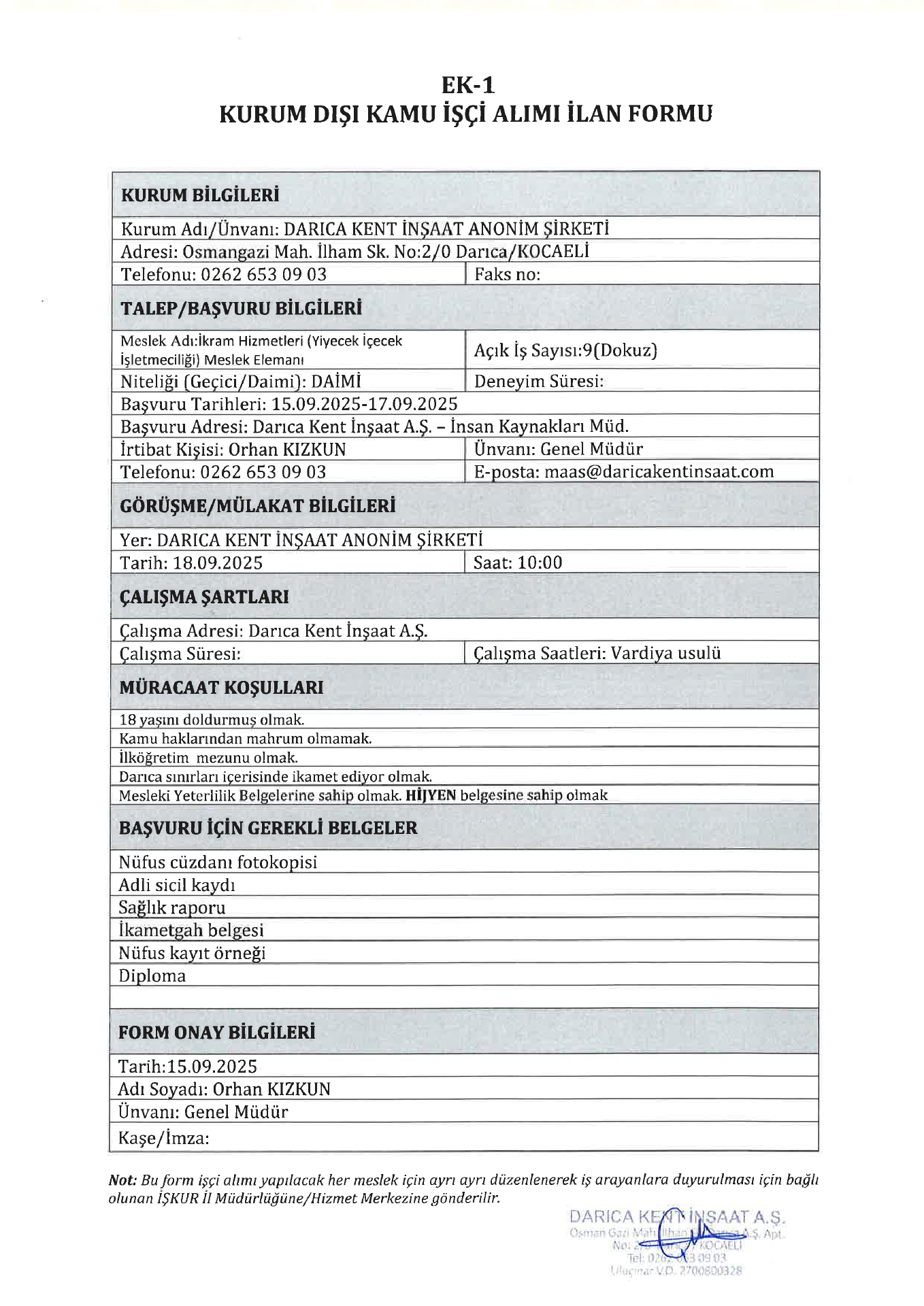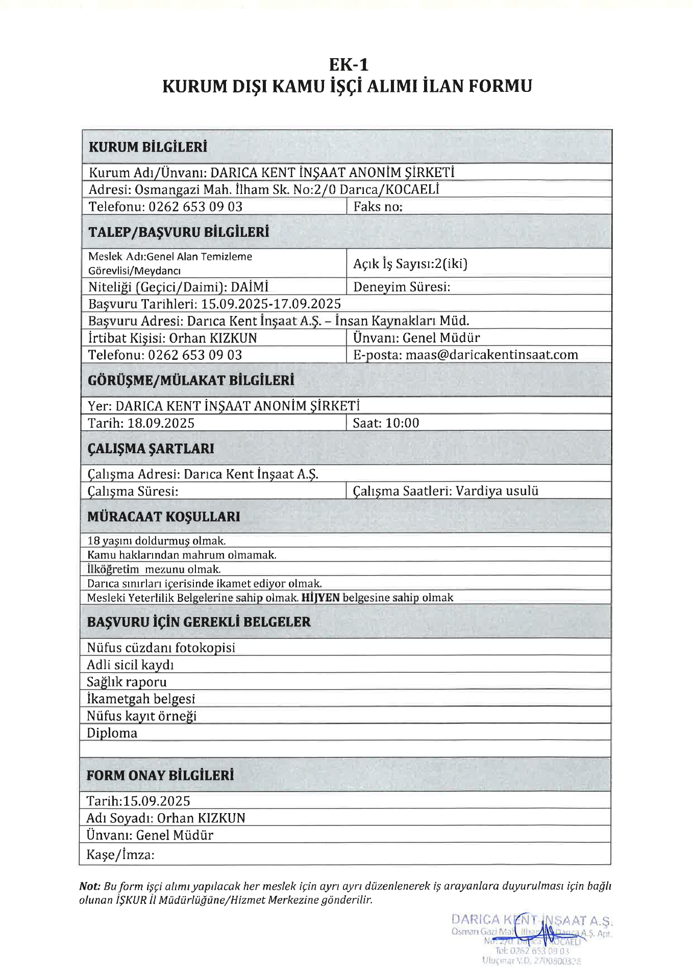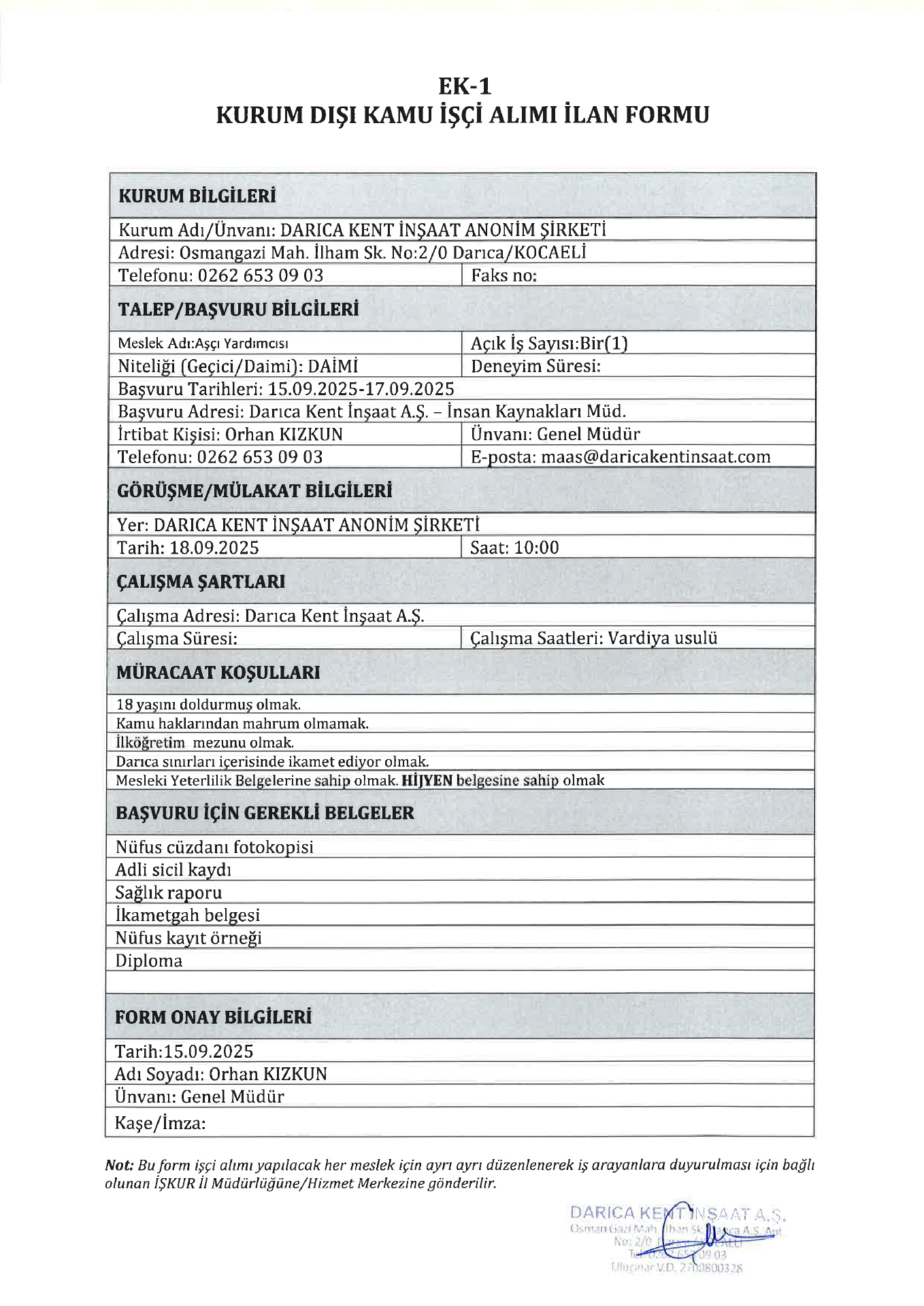 Kocaeli Darıca Kent İnşaat 12 İşçi Alacak. Son başvuru tarihi 17 eylül 2025
