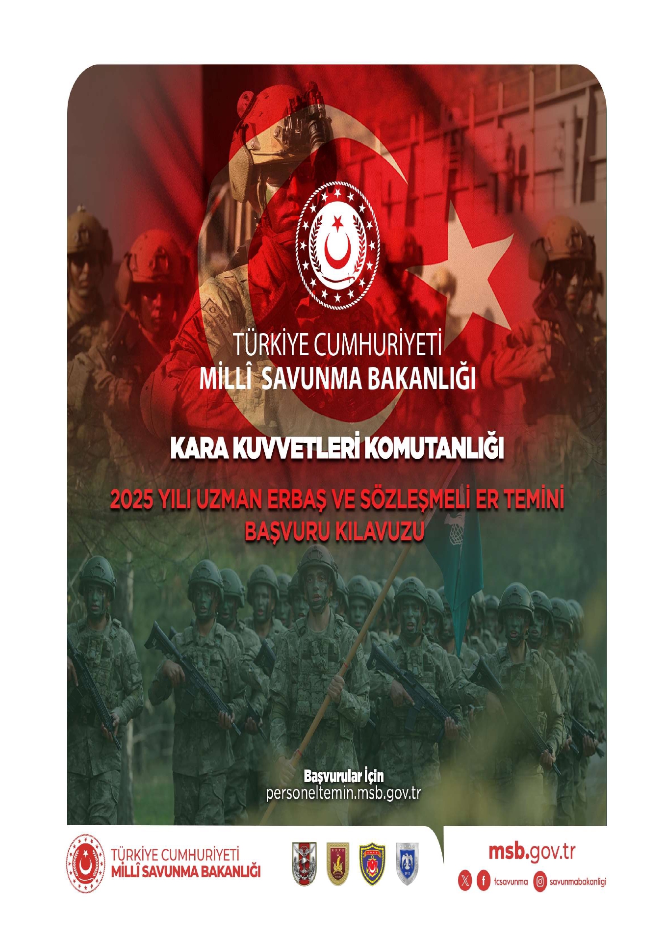 3. Bu kılavuz, Milli Savunma Bakanlığının 2025 yılında Kara Kuvvetleri Komutanlığı adına yapacağı Uzman Erbaş (Bölüm-1) ve Sözleşmeli Er (Bölüm-2) temini faaliyeti ile ilgili hususları kapsamaktadır.
