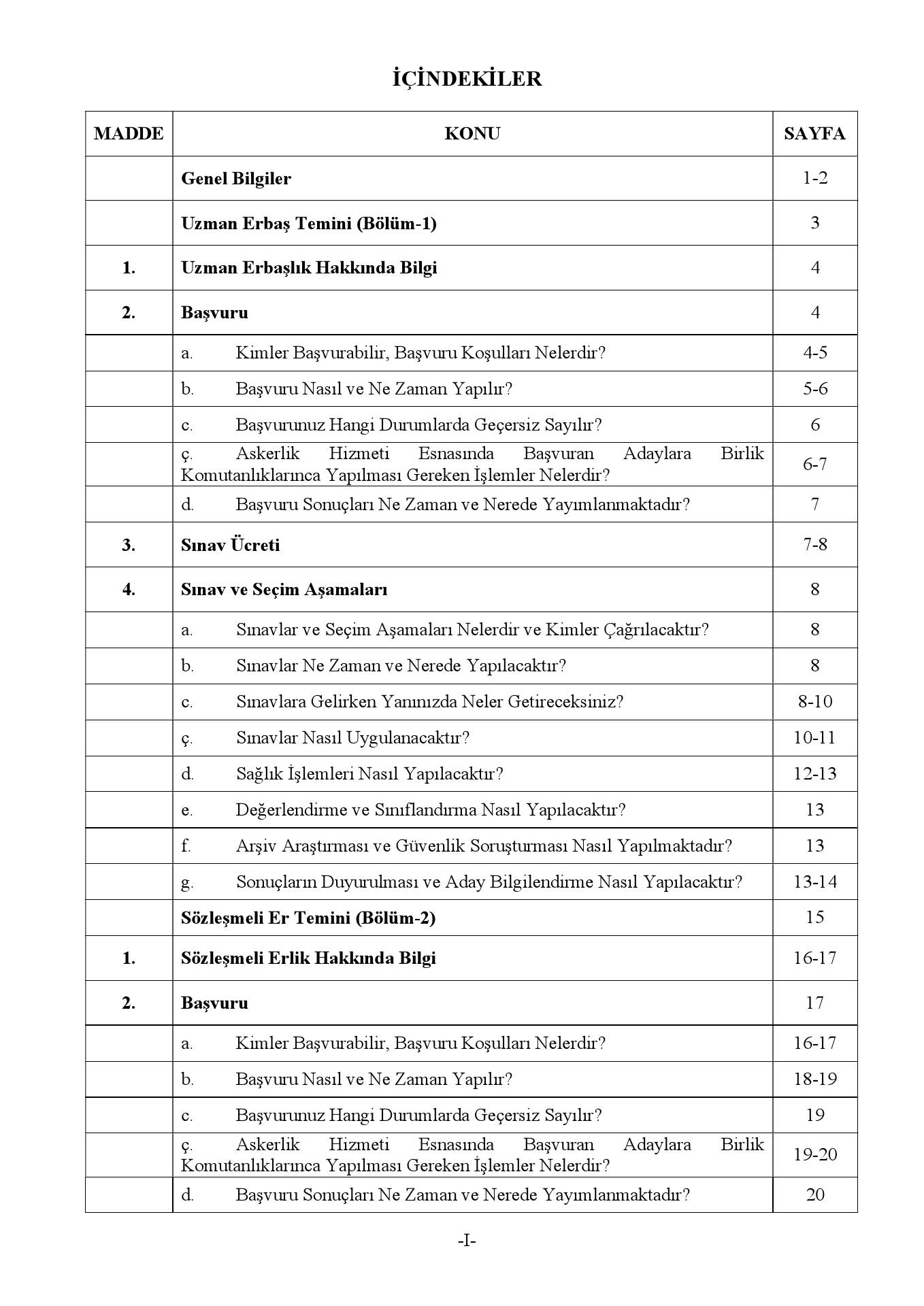 14. Uzman erbaş temin esasları, başvuru şartları ve seçim aşamaları Bölüm-1'de, sözleşmeli er temin esasları, başvuru şartları ve seçim aşamaları Bölüm-2'de yer almaktadır.