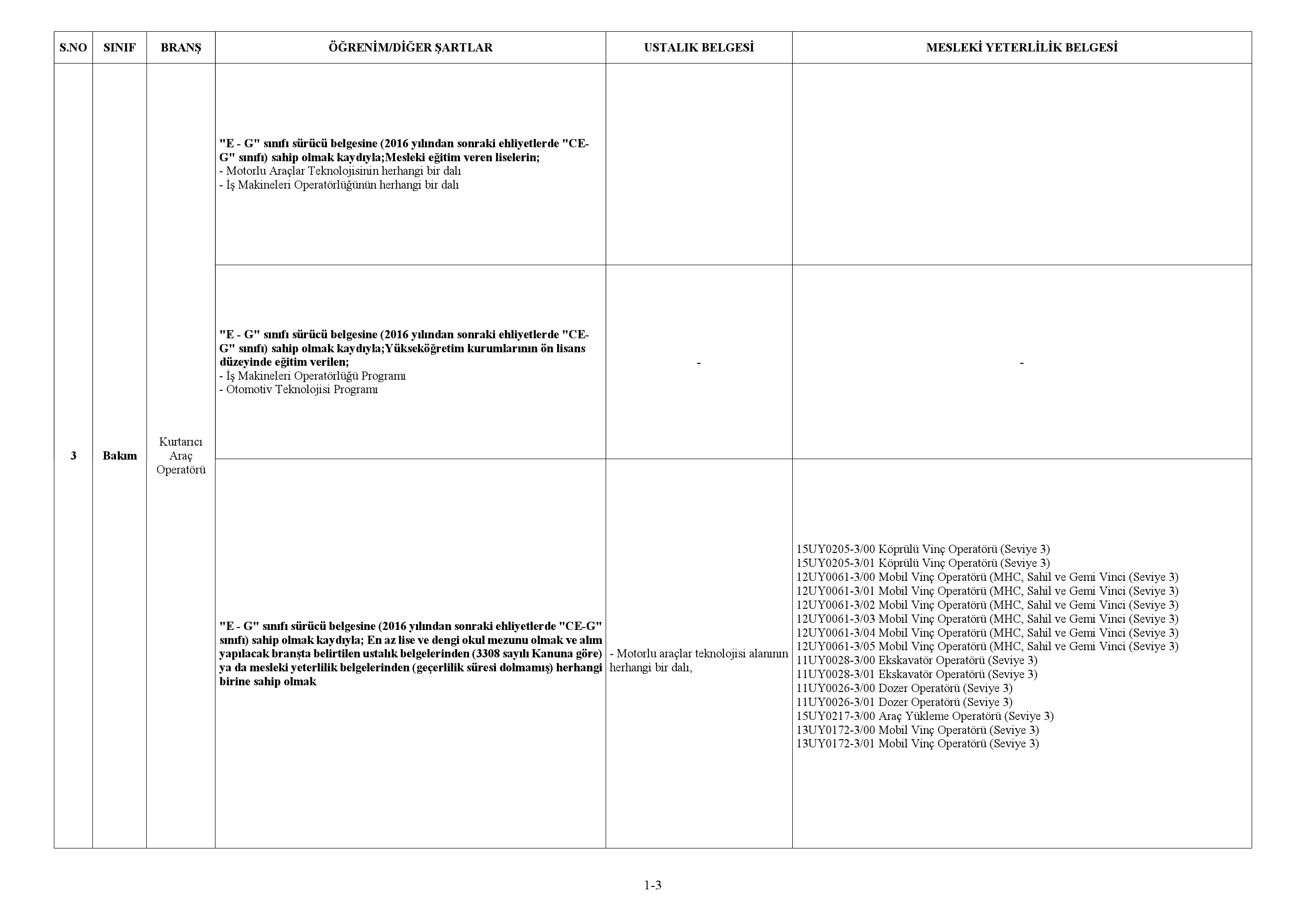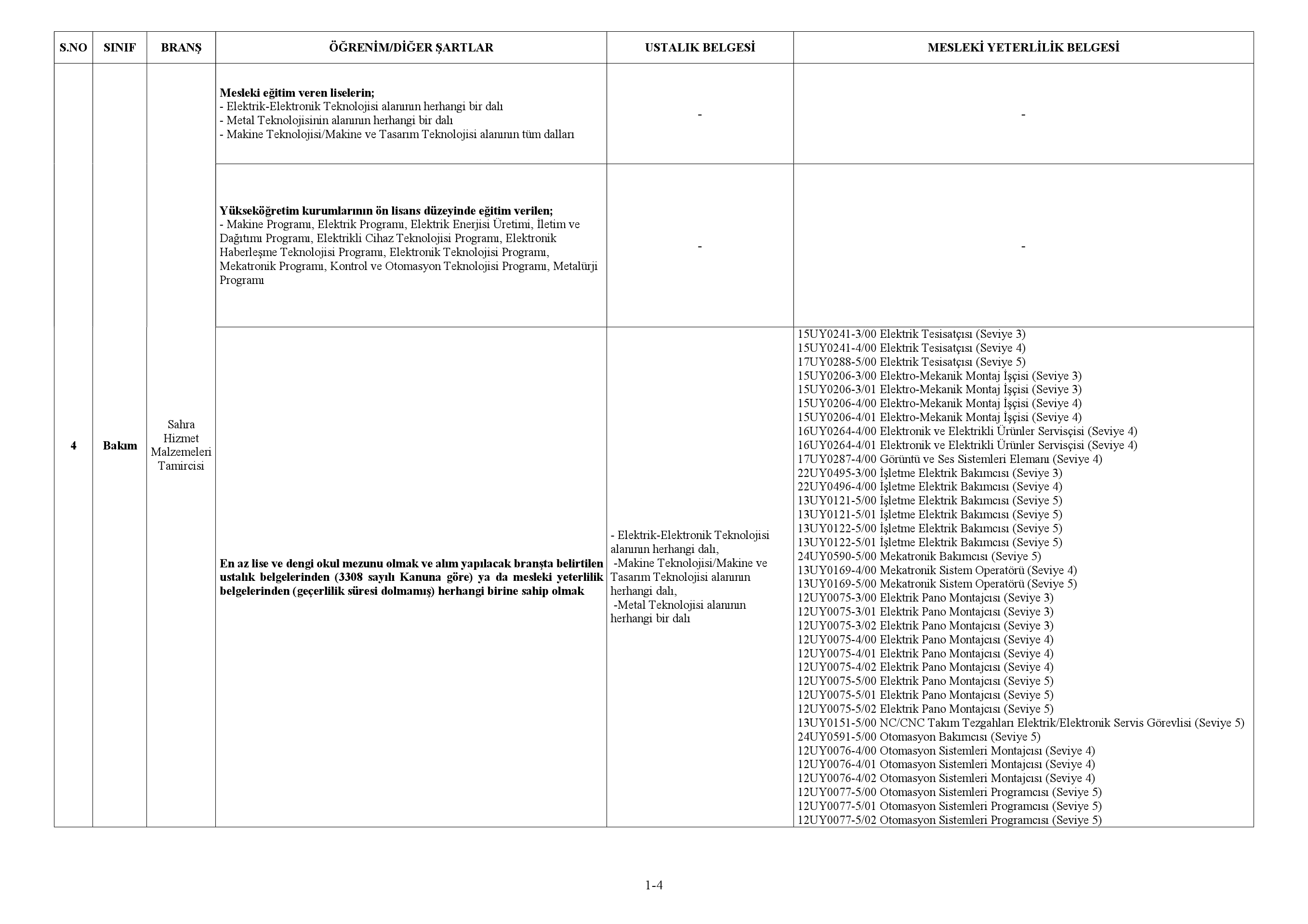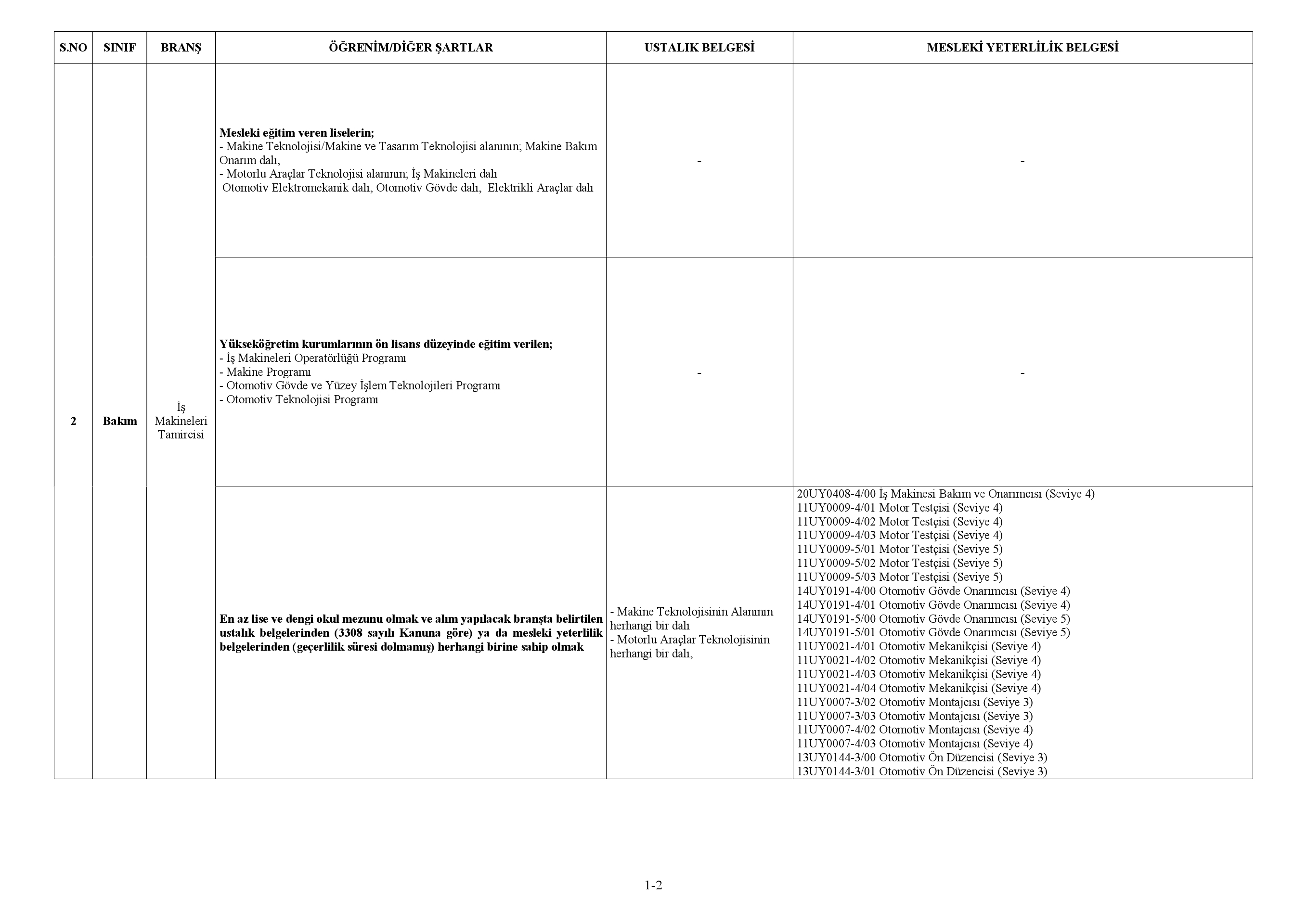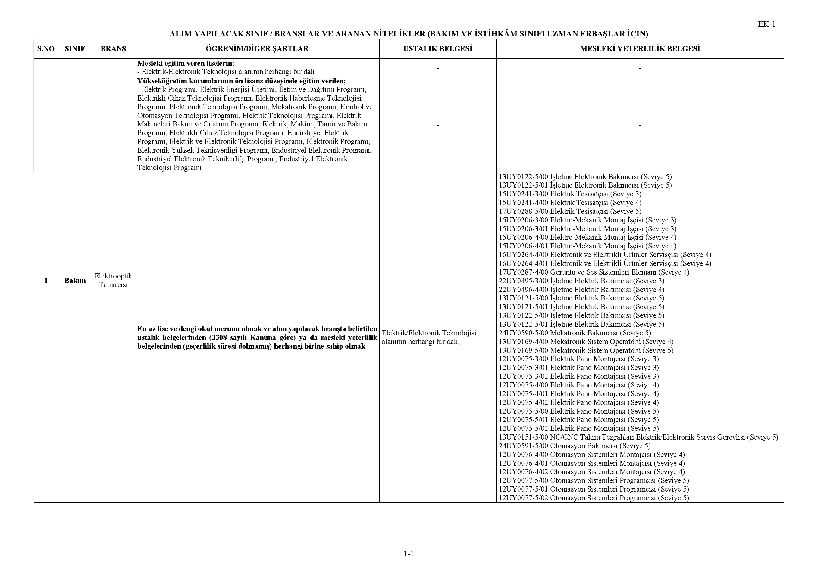 1- Alım Yapılacak Sınıf / Branşlar ve Aranan Nitelikler (Bakım ve İstihkam Sınıfı Uzman Erbaşlar İçin)