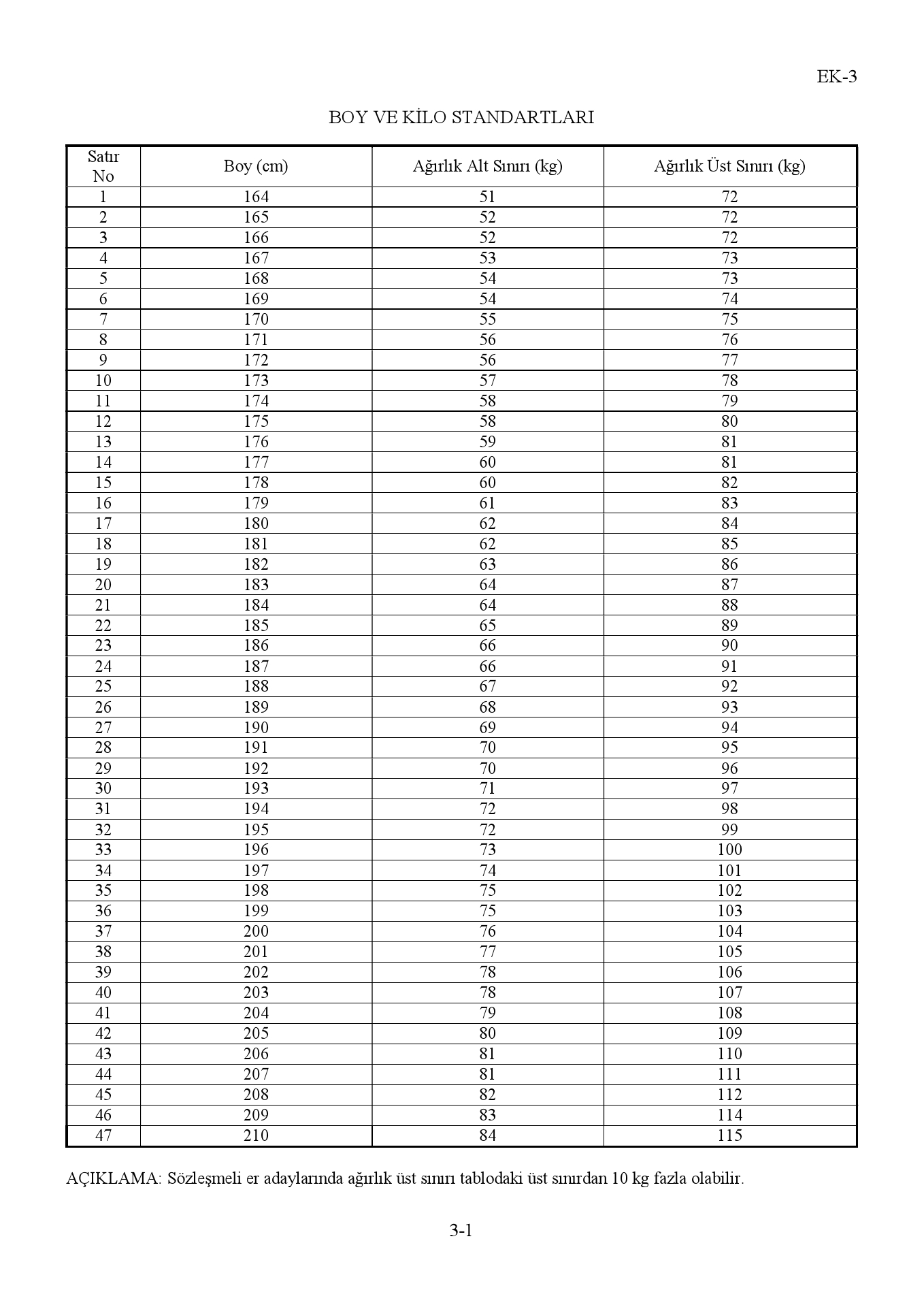 (24) En az 164 cm en fazla 210 cm boyunda olmak koşuluyla, Ek-3'te yer alan boy ve kilo oranları tablosunda belirtilen değerler içerisinde bulunmak (ağırlık, şortlu/eşofmanlı vücut ağırlığıdır. Boy, çıplak ayakla ölçülür).