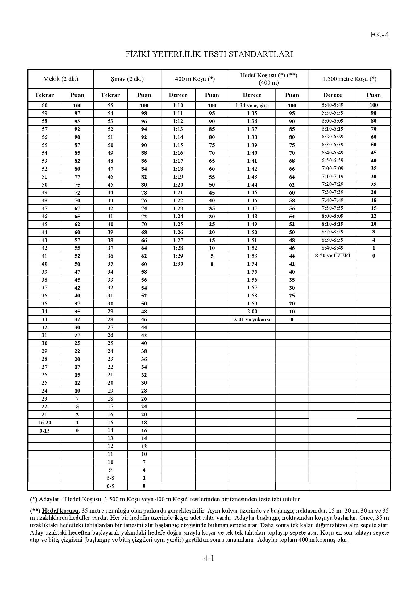 (b) Adaylar; sınav merkezinin fiziki ve iklim şartları dikkate alınarak yapılacak olan 400 metre düz koşu veya 400 metre hedef koşusundan herhangi biri ile mekik ve şınav testlerine tabi tutulmaktadır. Fiziki Yeterlilik Testi Standartları Ek-4'tedir.
